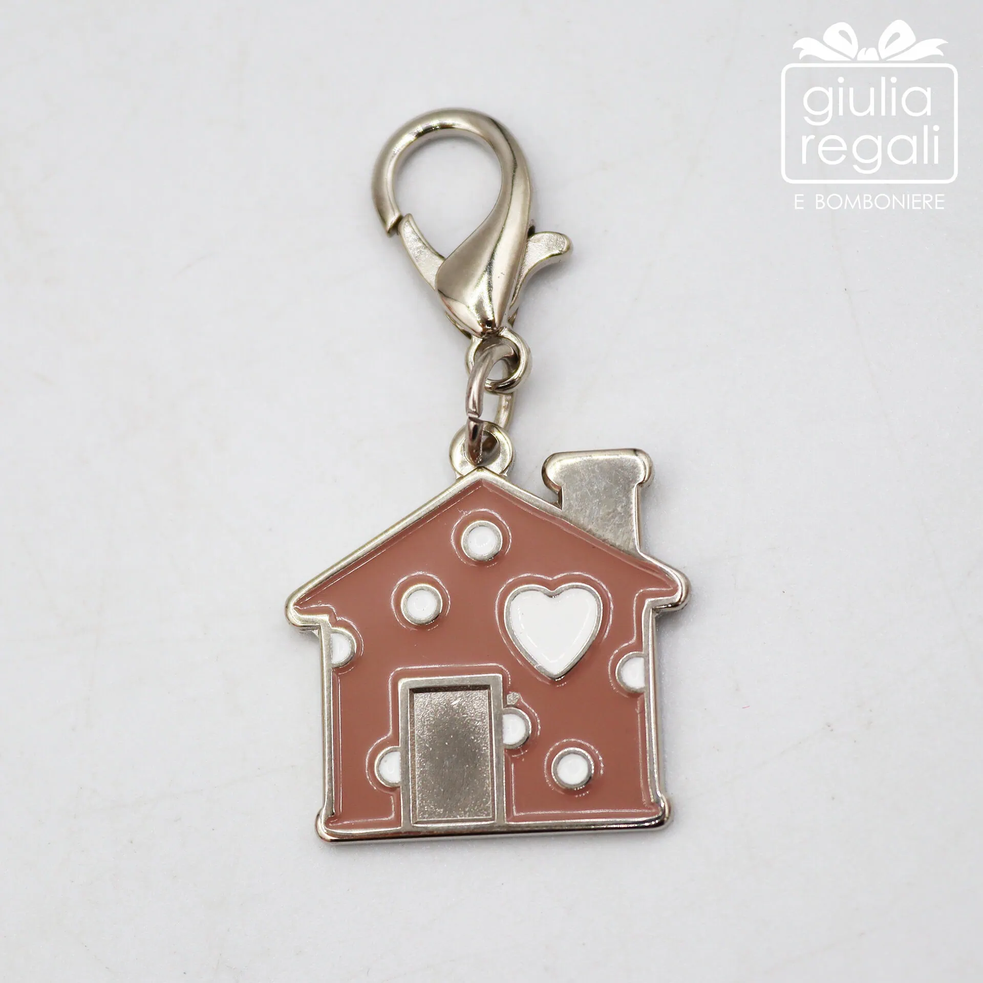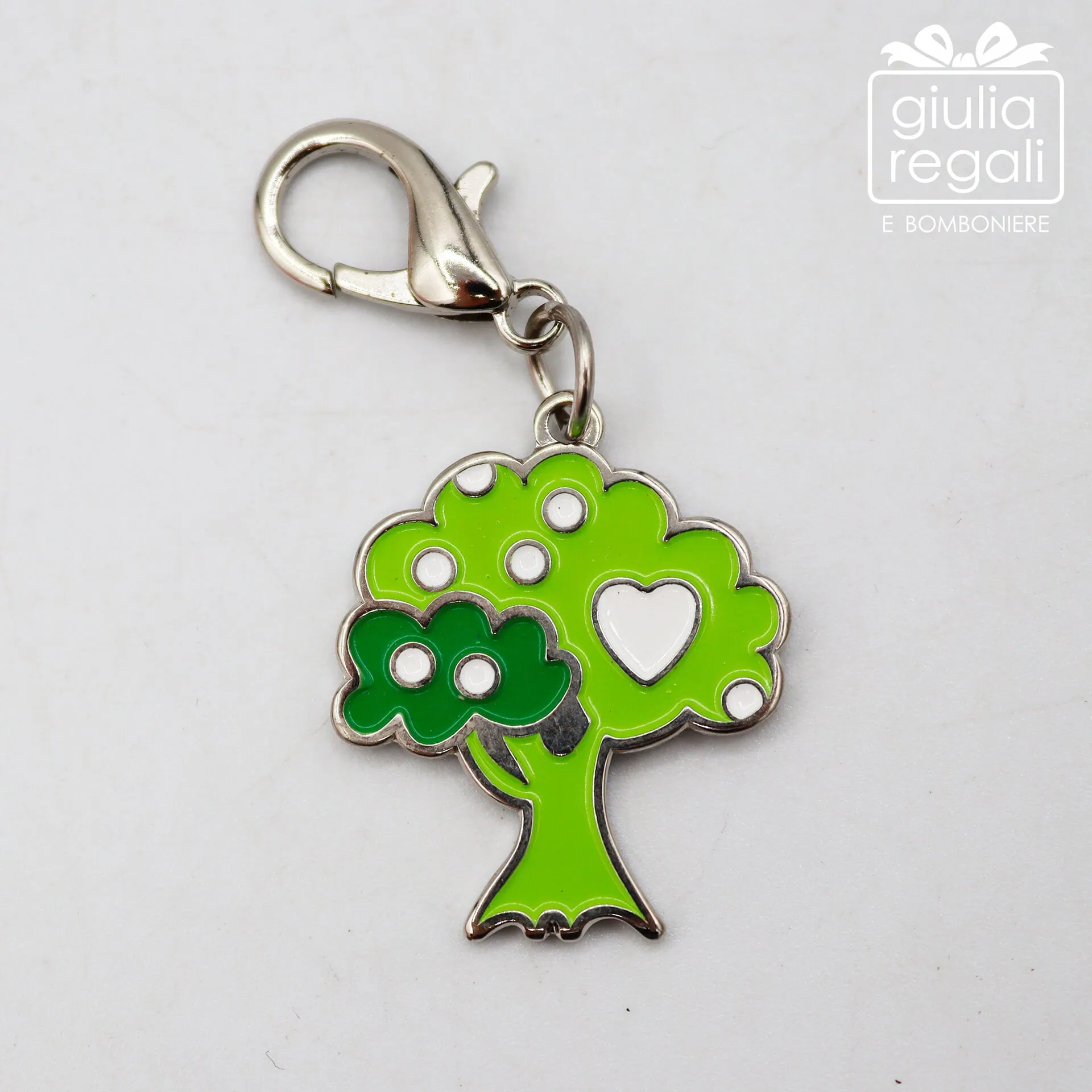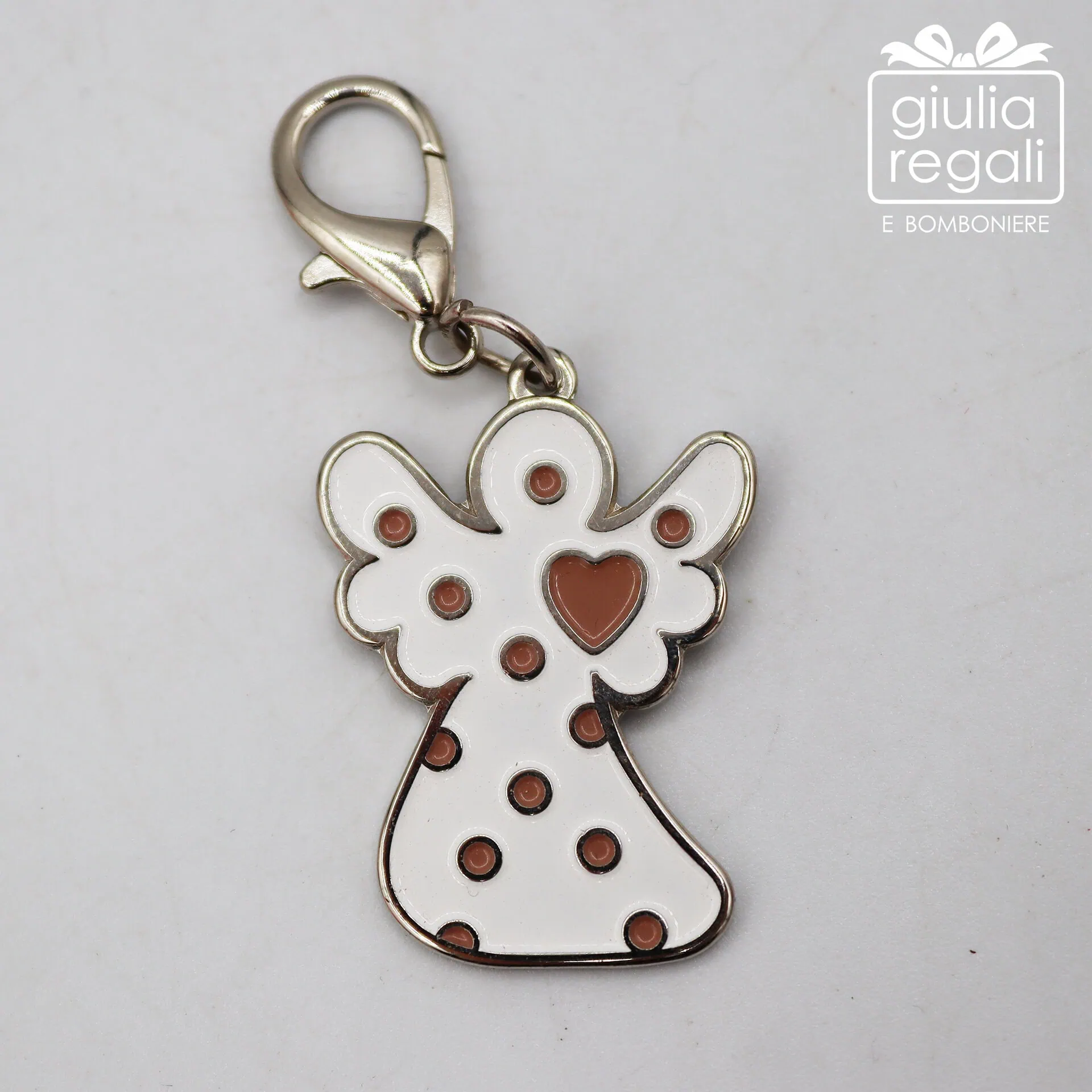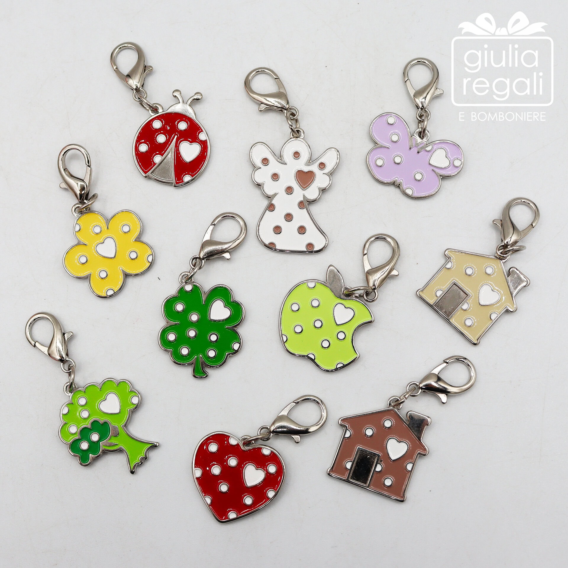 I modelli disponibili includono diverse forme simboliche come cuore, casetta, mela, albero, angelo, quadrifoglio, farfalla, fiore e coccinella, tutte impreziosite da smalto lucido e piccoli dettagli decorativi.