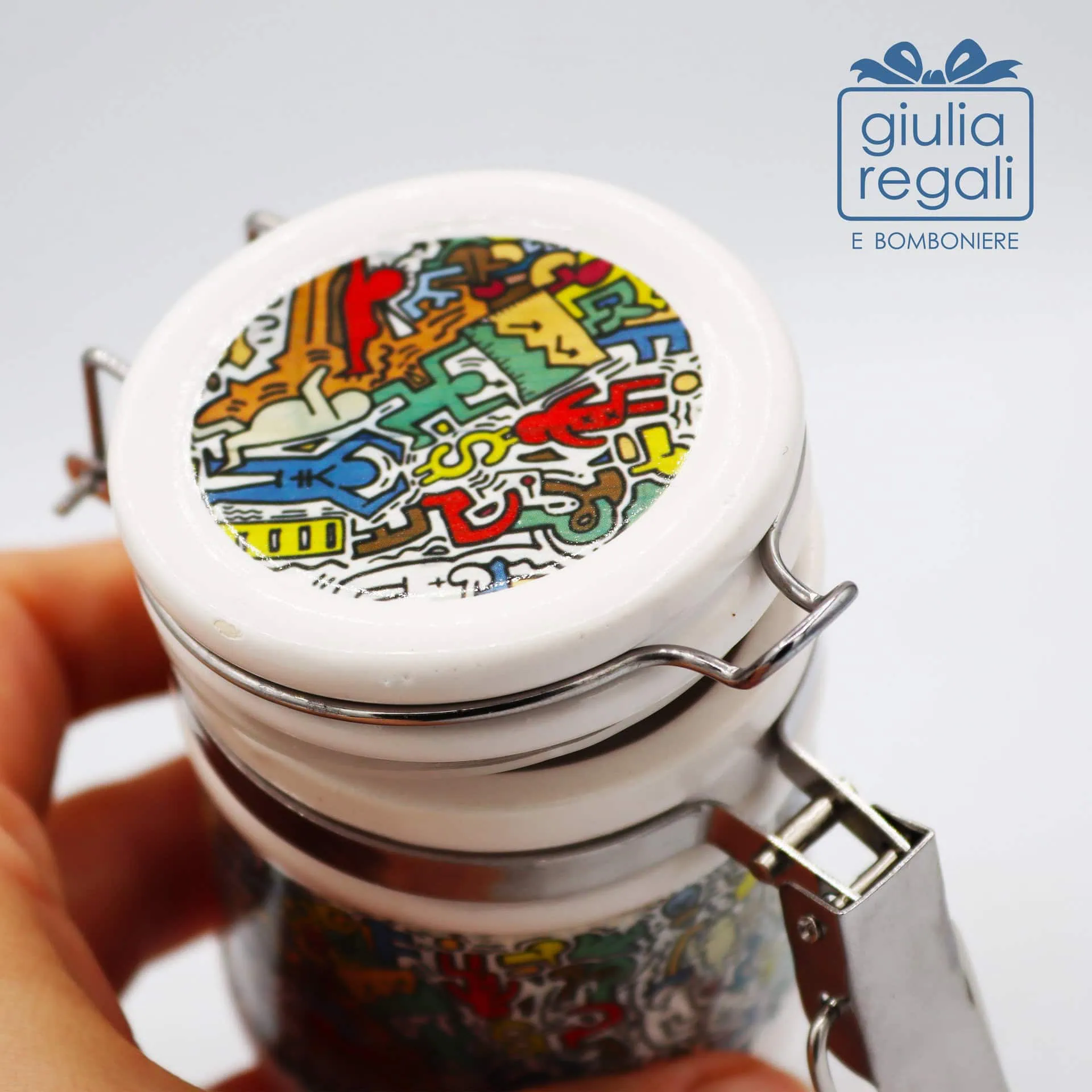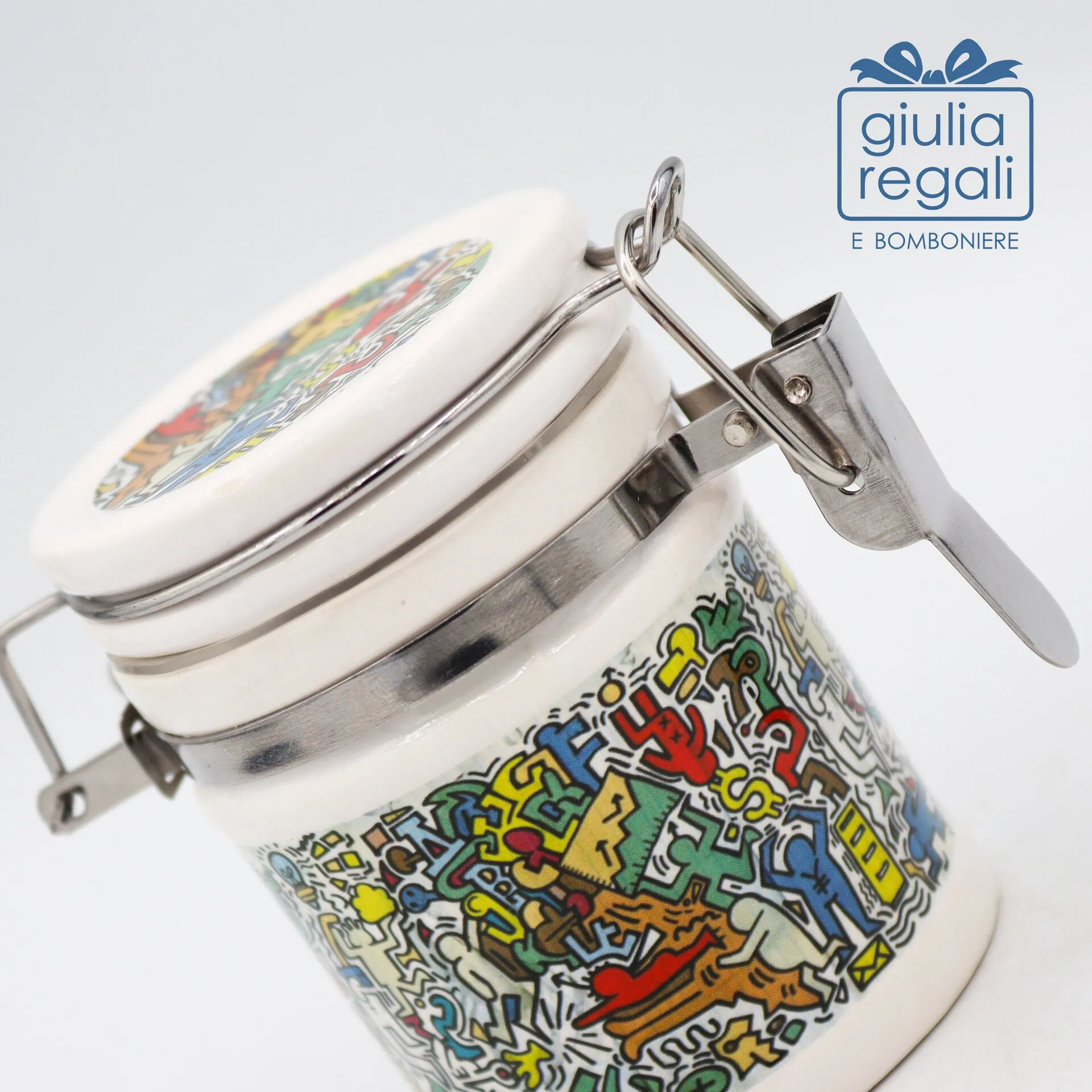 Barattolino in ceramica linea “Graffiti” con chiusura ermetica in metallo. Diametro 5,7 cm, altezza 7,7 cm. Disponibile anche come bomboniera.