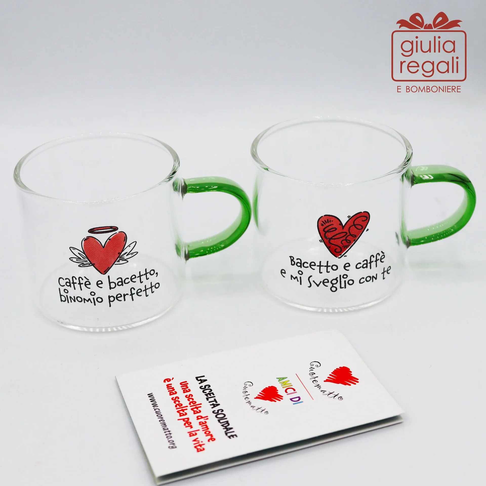 Set di 2 tazzine in vetro borosilicato Cuorematto con cuoricini e frasi romantiche. Un’idea bomboniera utile e simbolica, fornita con scatola.