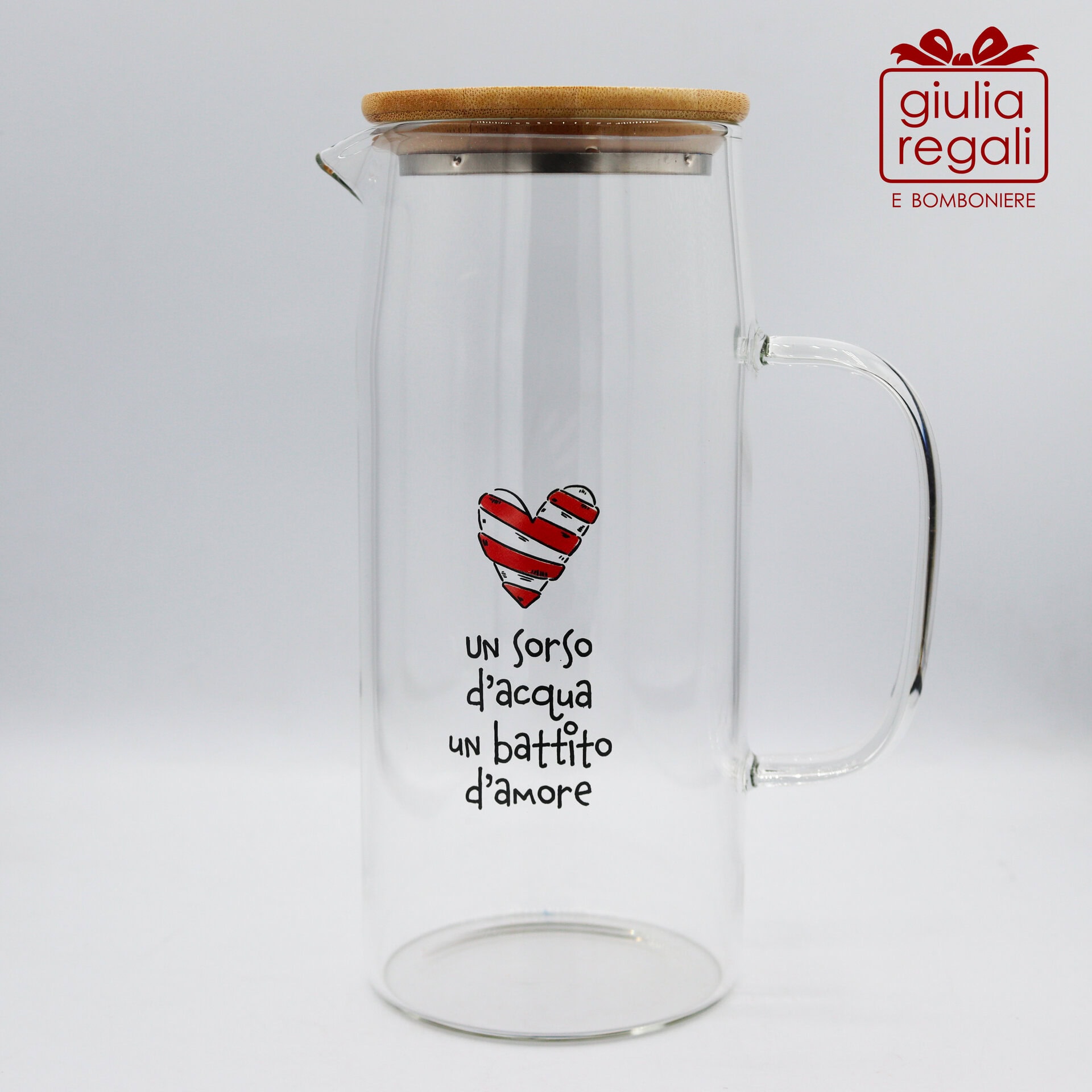 Caraffa in vetro borosilicato trasparente, decorata con delicati cuoricini e scritta “Un sorso d’acqua, un battito d’amore”, appartenente alla linea Amici di Cuorematto. Un oggetto elegante e funzionale, ideale come idea regalo solidale o bomboniera per occasioni speciali.