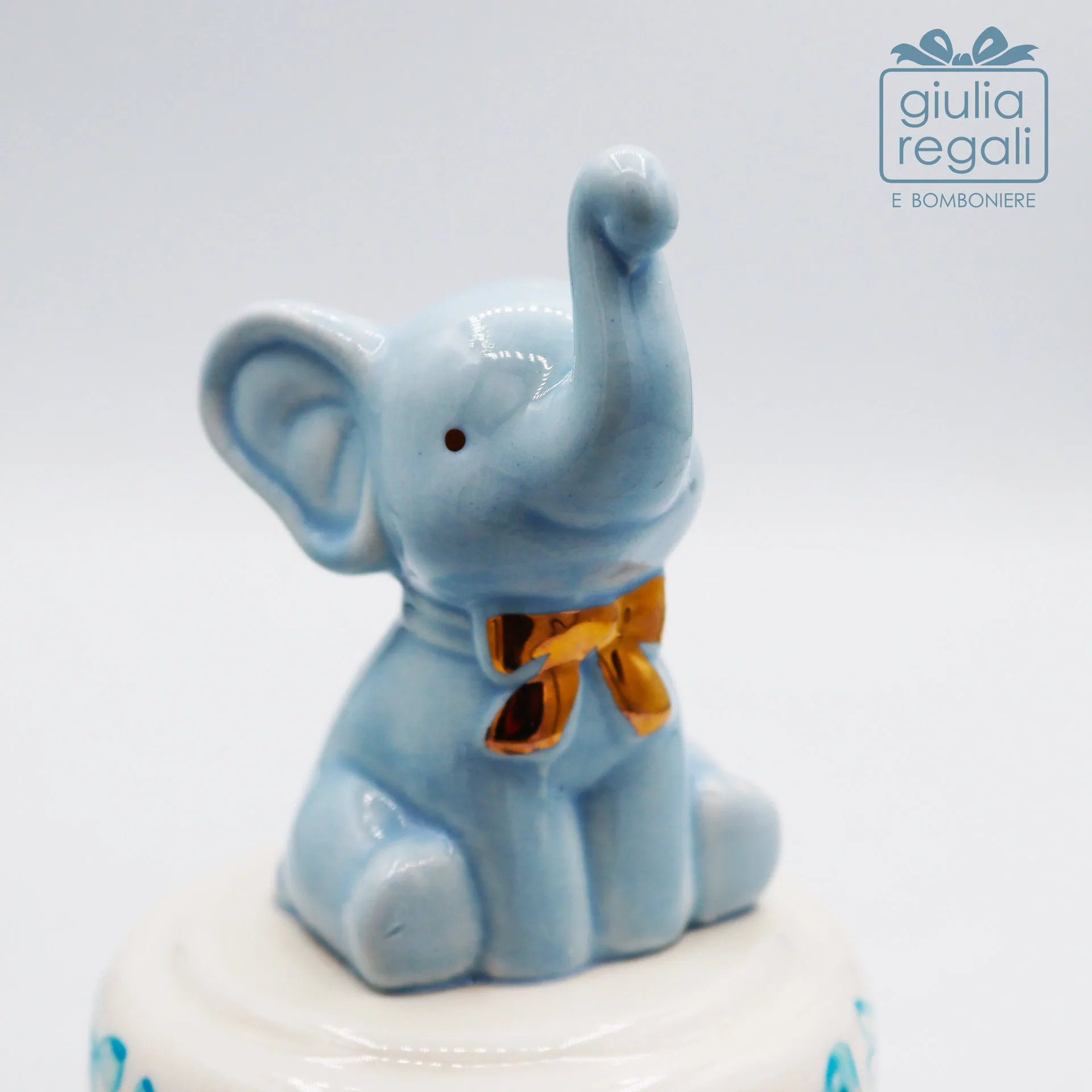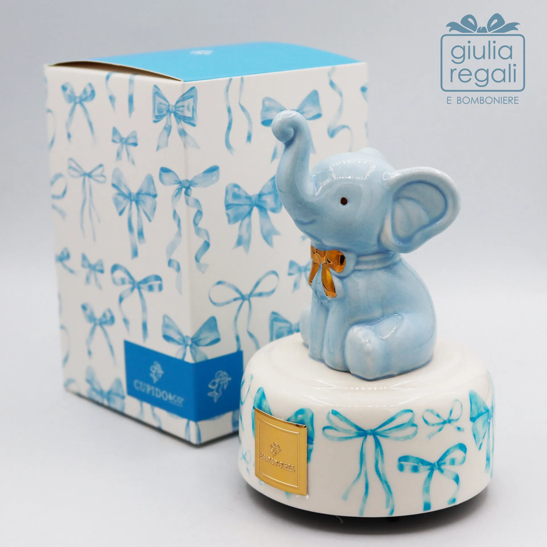 Carillon raffigurante un dolce elefantino celeste realizzato in porcellana smaltata, curato nei dettagli e impreziosito da un piccolo fiocco dorato sul collo. La statuina è posizionata su una base in porcellana decorata con delicati fiocchi azzurri, che conferiscono all’insieme uno stile tenero e raffinato.