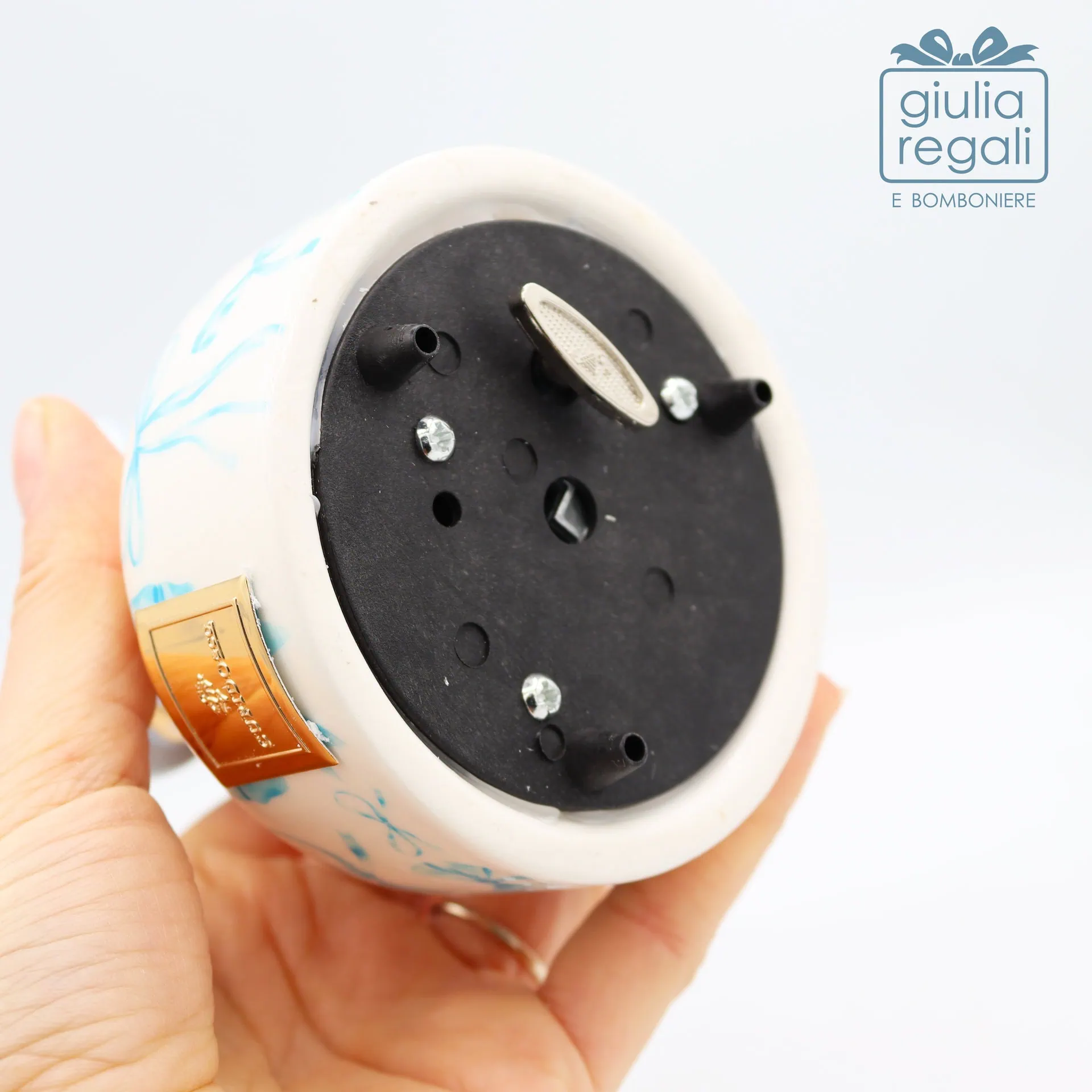 Il carillon suona tramite ingranaggio manuale situato sotto la base. La melodia si attiva ruotando la chiavetta, mentre l’elefantino rimane fisso e non gira durante il funzionamento. Un meccanismo semplice e affidabile, pensato per accompagnare nel tempo questo oggetto speciale.