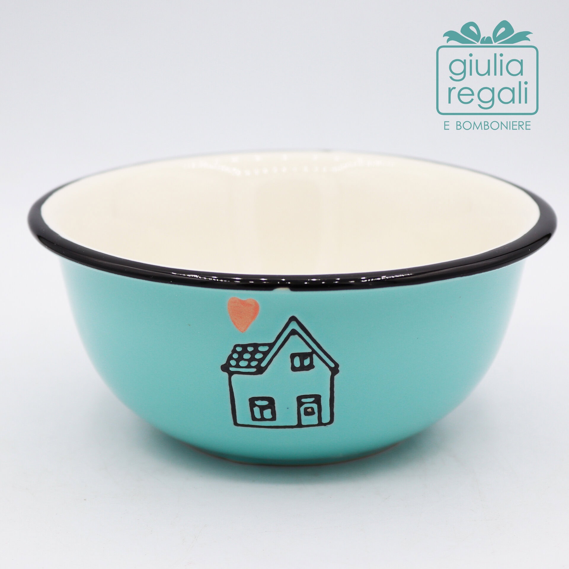 Realizzata in ceramica, si distingue per il colore verde acqua morbido e contemporaneo, impreziosito da un bordo nero a contrasto che definisce la linea con eleganza. Il piccolo disegno della casetta con cuore aggiunge un dettaglio delicato e simbolico, perfetto per chi ama oggetti semplici ma con personalità.