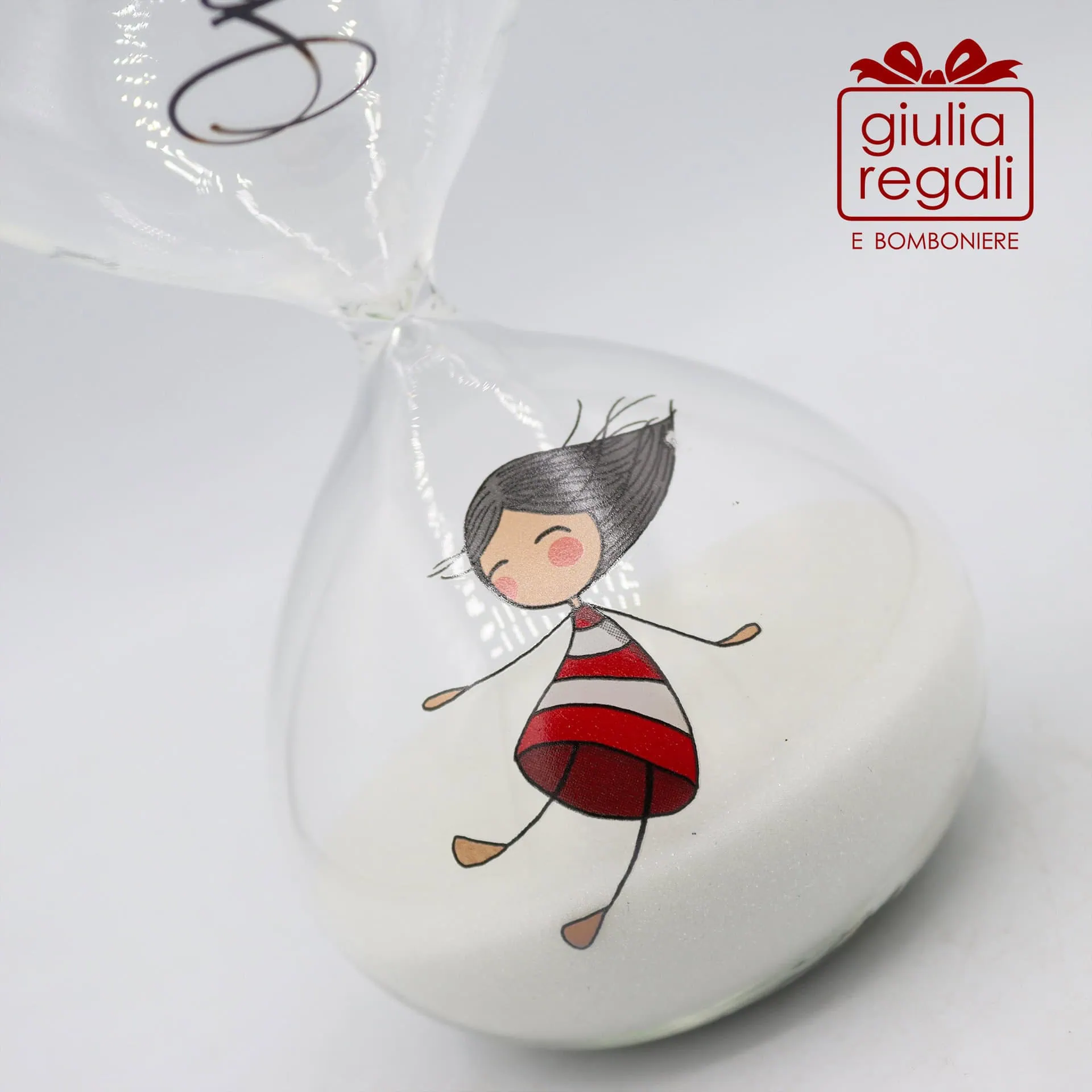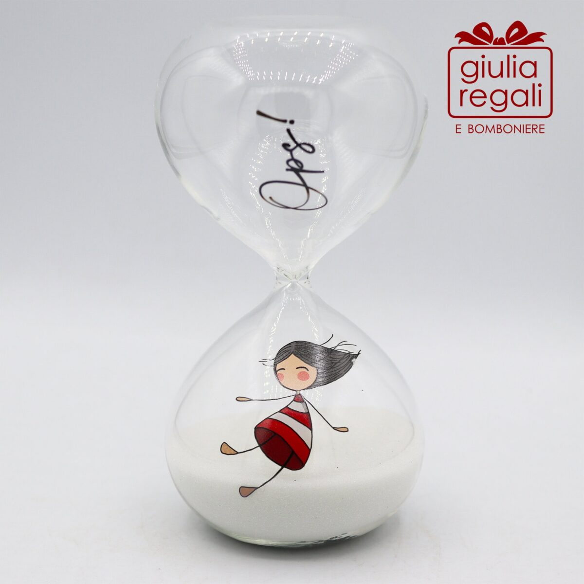Questa clessidra da 15 minuti della Linea La Tipa per Cuorematto è realizzata in vetro trasparente con sabbia bianca e impreziosita dall’illustrazione della simpatica figura femminile accompagnata dalla scritta “Oops!”, dettaglio che la rende originale e riconoscibile.