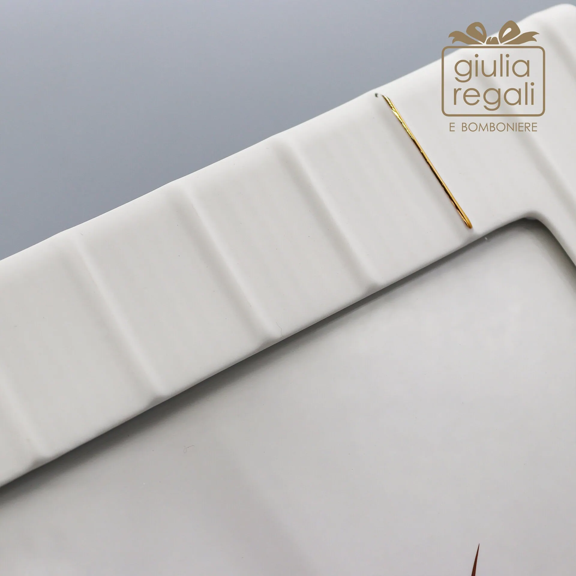 Una cornice portafoto dal gusto sobrio ed elegante, impreziosita da un sottile inserto oro che ne valorizza le linee essenziali. Il design pulito e leggermente ondulato della struttura la rende adatta sia ad ambienti classici che moderni.