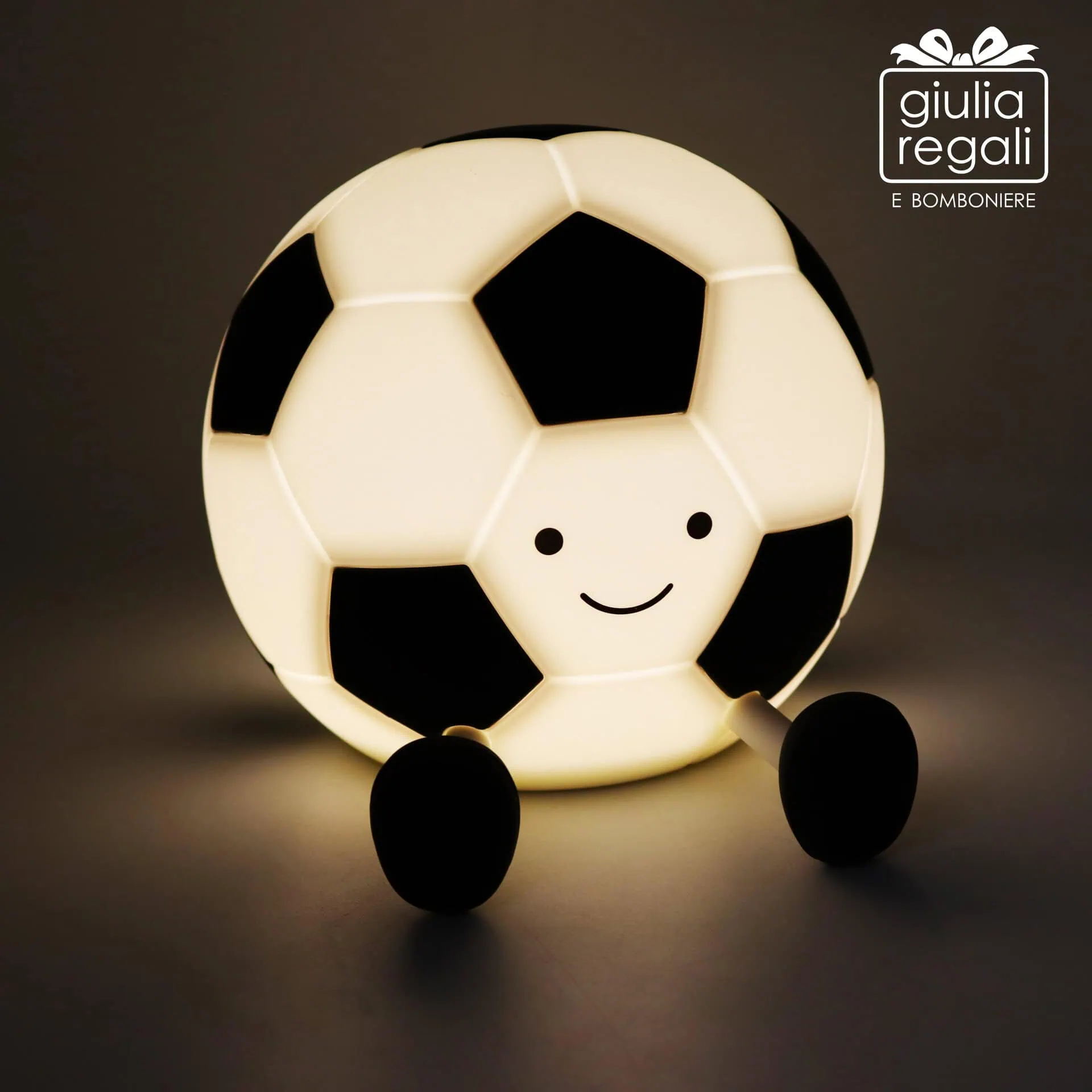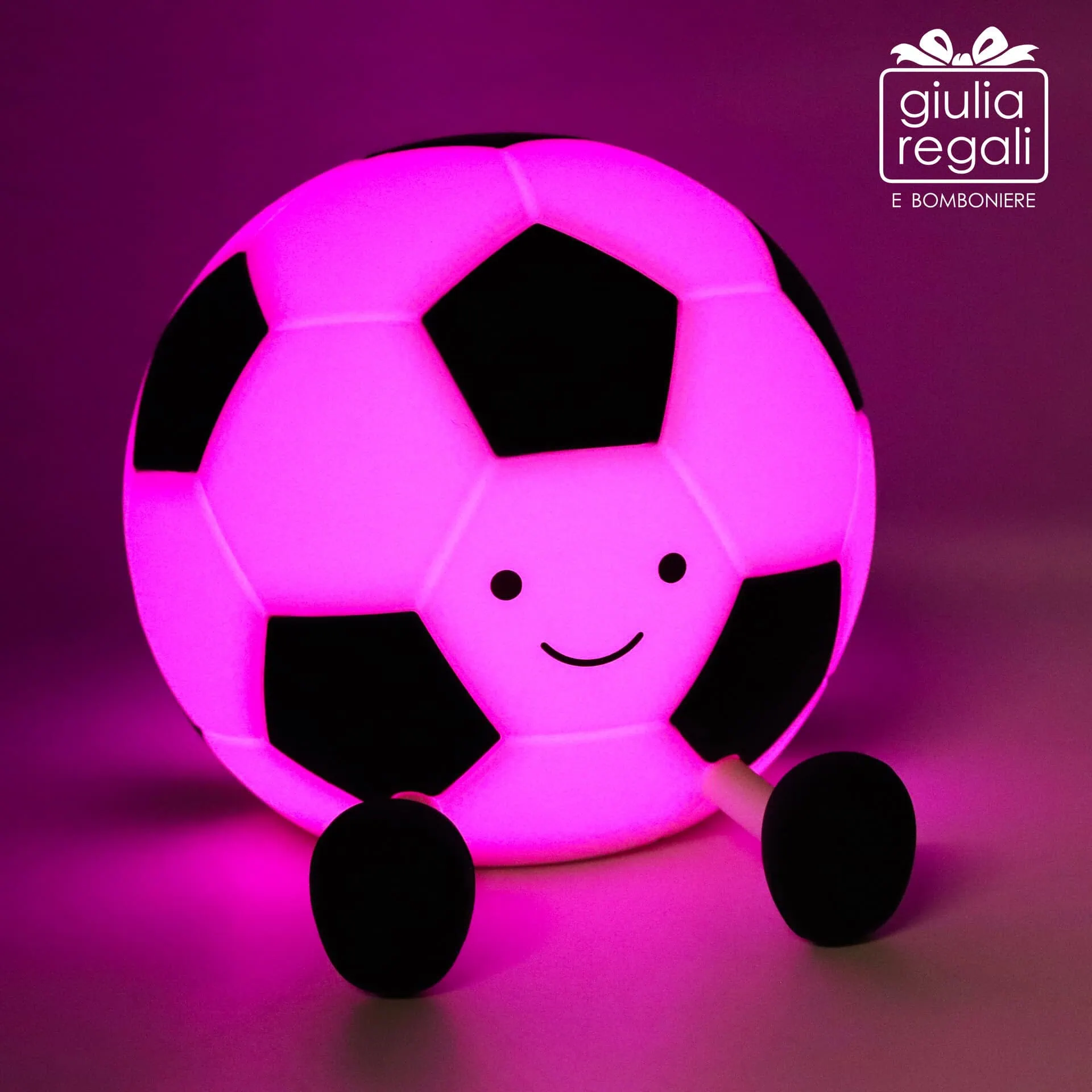 La lampada emette una luce LED multicolore, con colori che si alternano creando un’atmosfera allegra ma delicata, ideale come luce notturna per la cameretta. Il design a pallone da calcio con espressione sorridente e piedini decorativi la rende un elemento divertente e rassicurante.