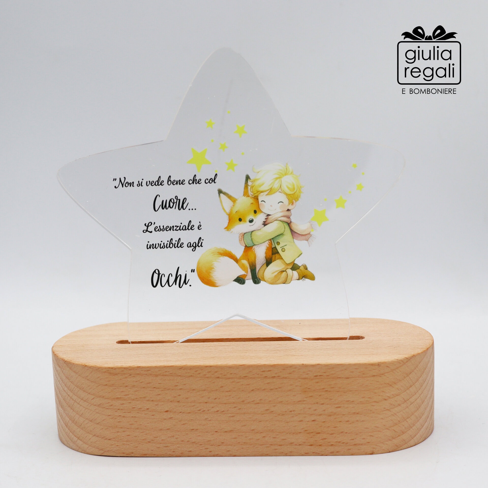 Lampada LED a forma di stella ispirata al Piccolo Principe, realizzata in plexiglass trasparente decorato con illustrazione e frase iconica, montata su una base in legno naturale.