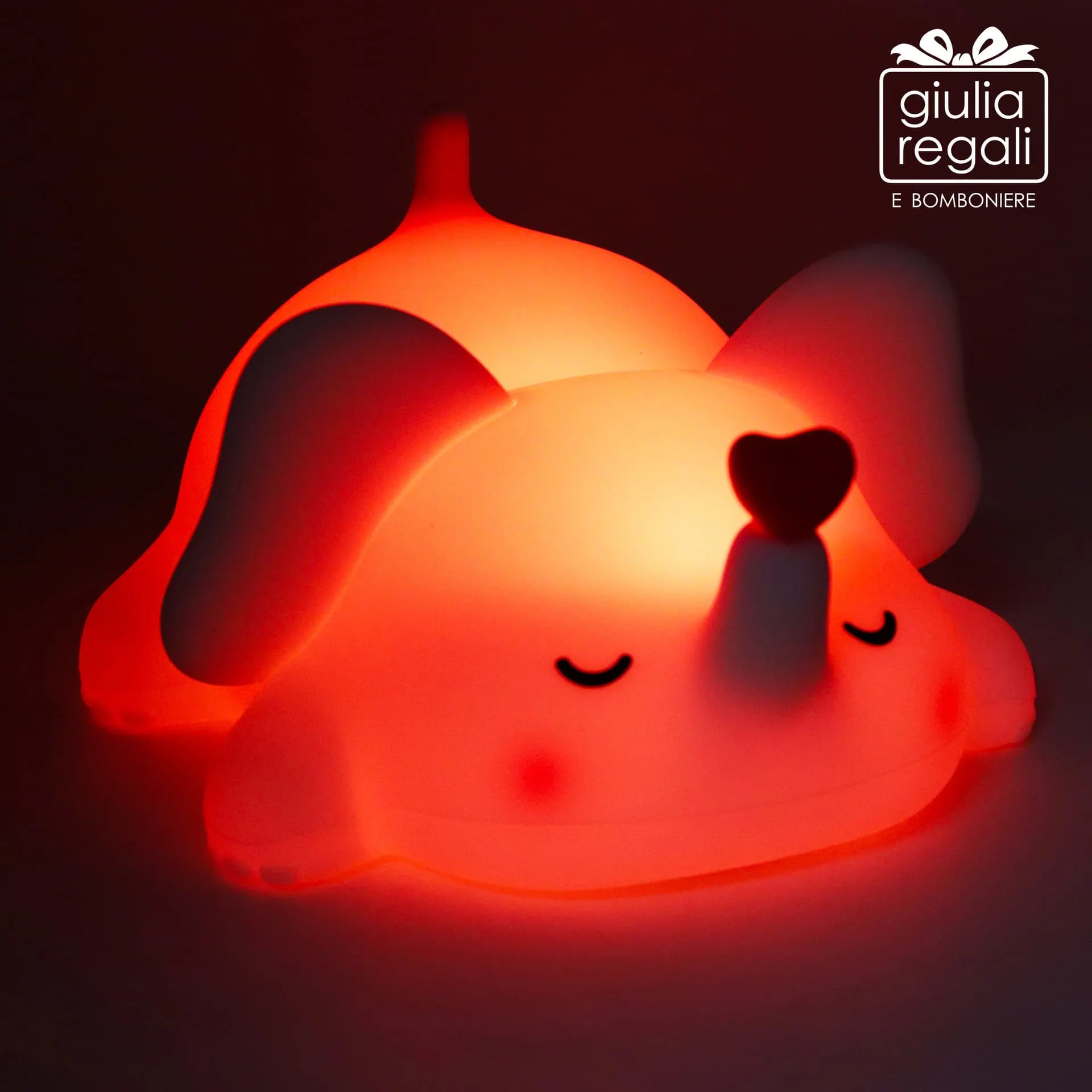 Lampada LED a forma di elefantino in silicone morbido, con cuoricino decorativo. Emana una luce soffusa multicolore ideale come luce notturna per bambini. Dimensioni 14x12x8 cm. Cavetto USB incluso.