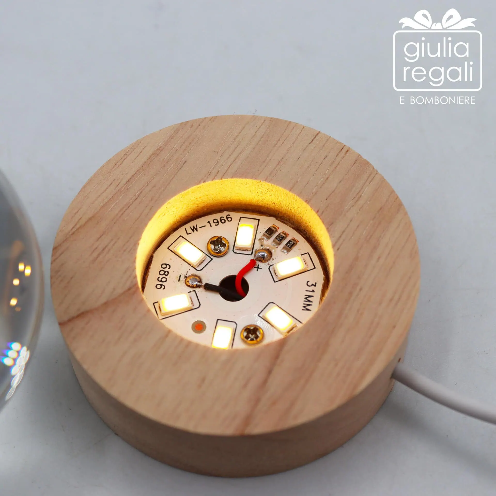 La base in legno naturale valorizza l’estetica dell’oggetto e integra il sistema di illuminazione con cavo USB collegato direttamente alla base, per un design pulito e armonioso.