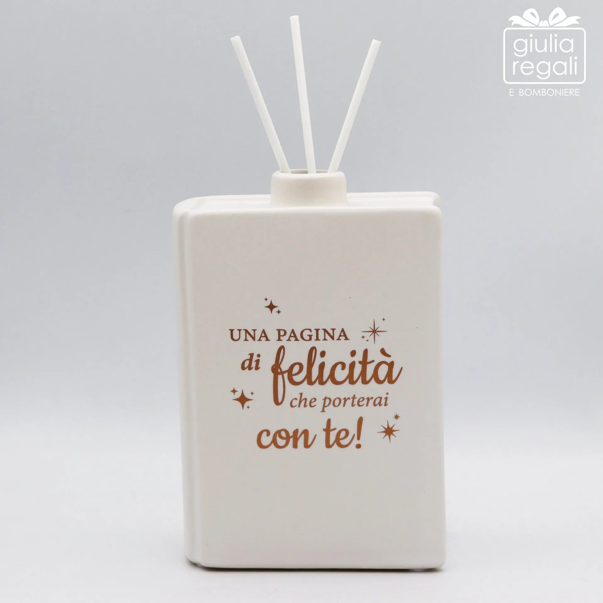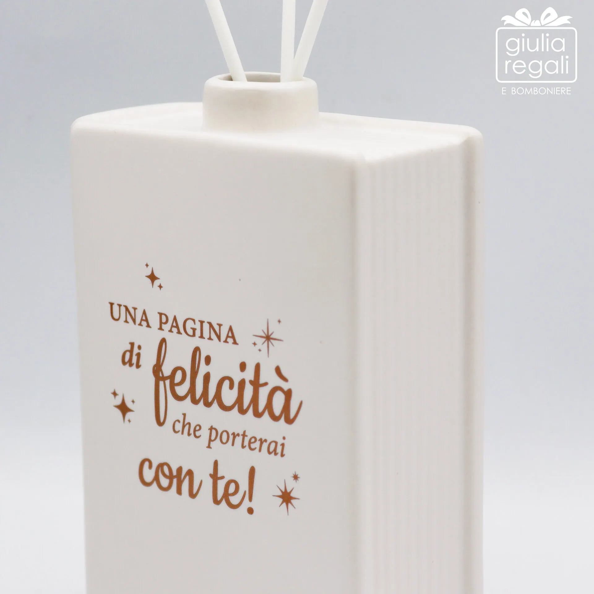 Profumatore d’ambiente in ceramica bianca a forma di libro con scritta dorata e bastoncini diffusori. Elegante, simbolico e raffinato.