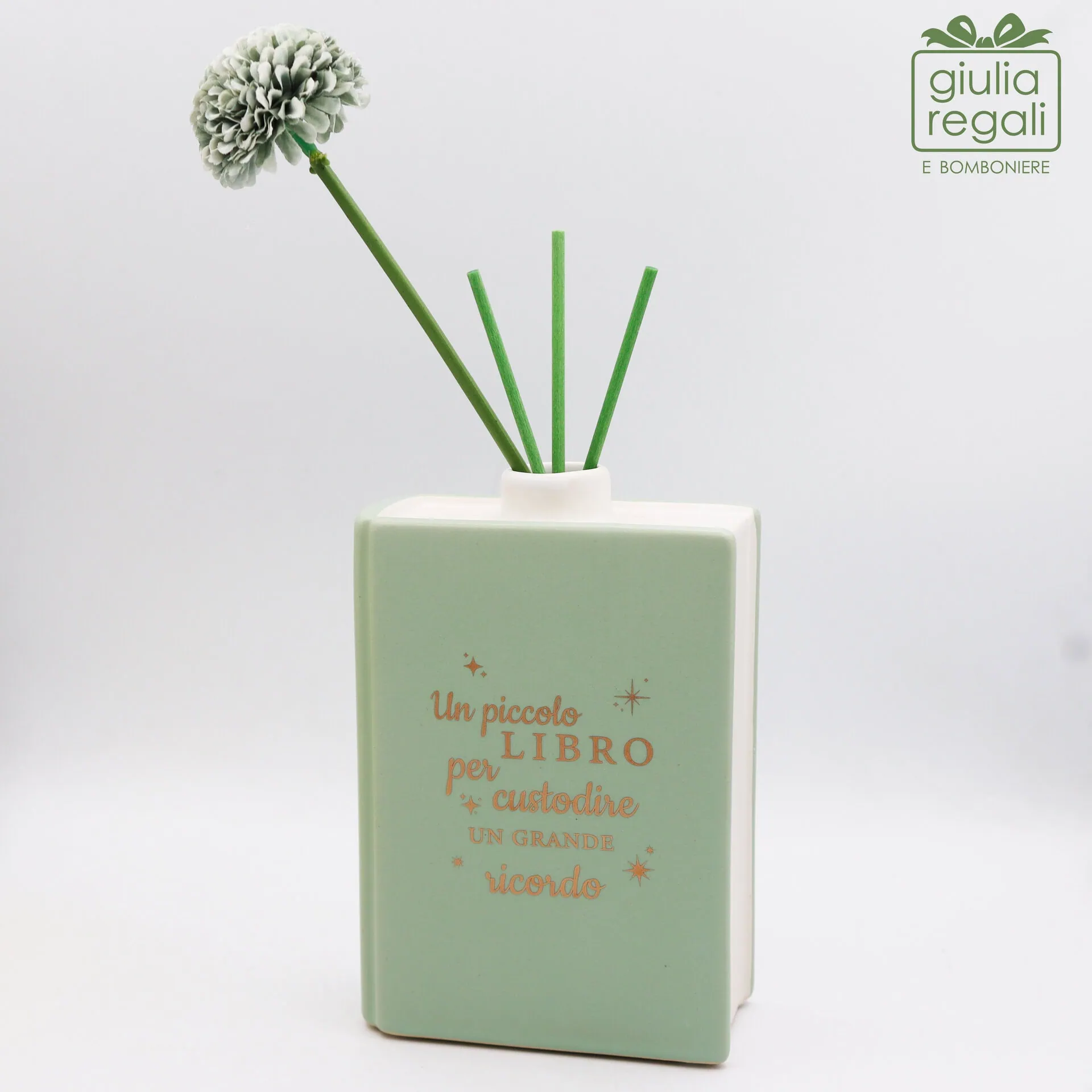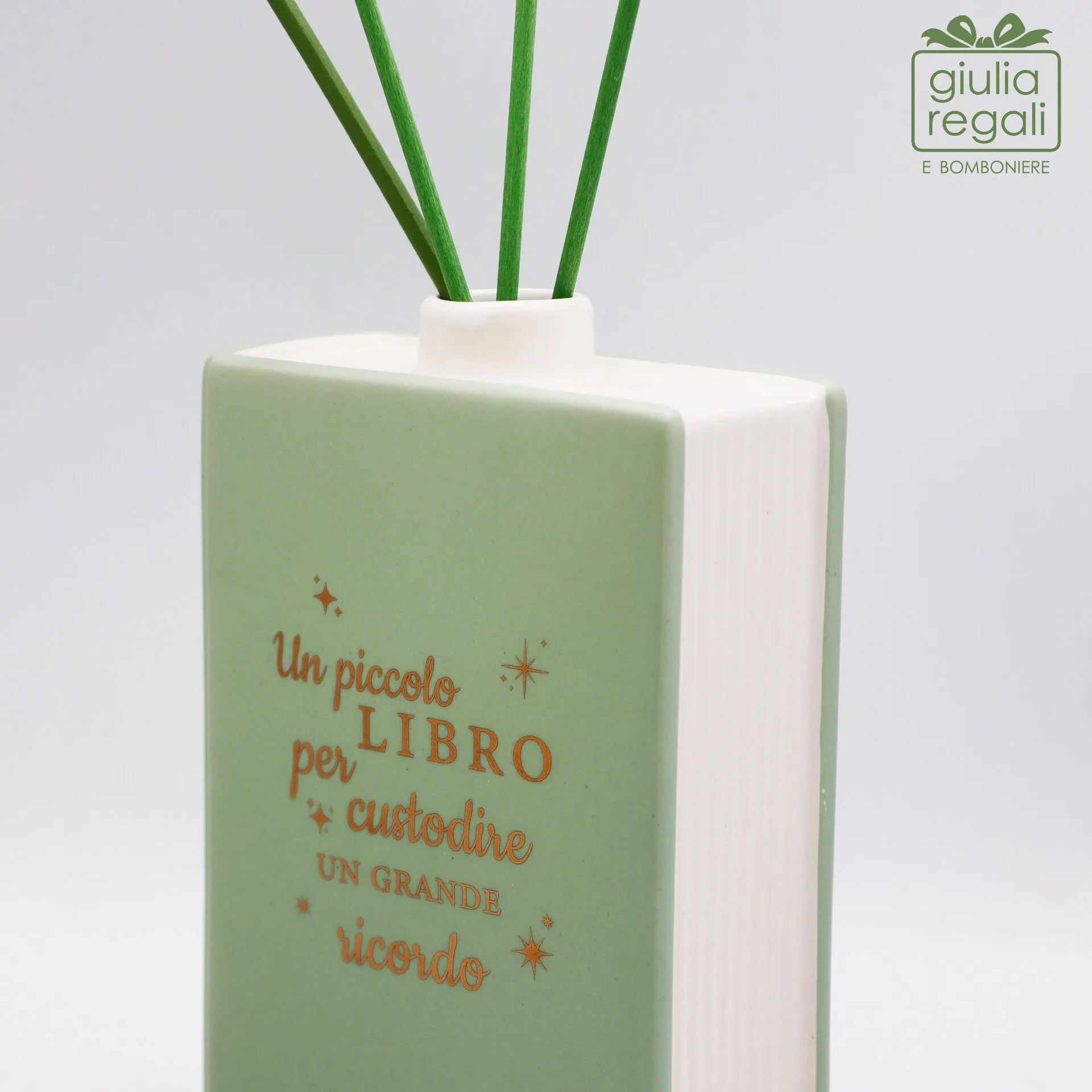 Profumatore d’ambiente in ceramica verde a forma di libro con scritta dorata e bastoncini diffusori. Elegante, simbolico e raffinato.