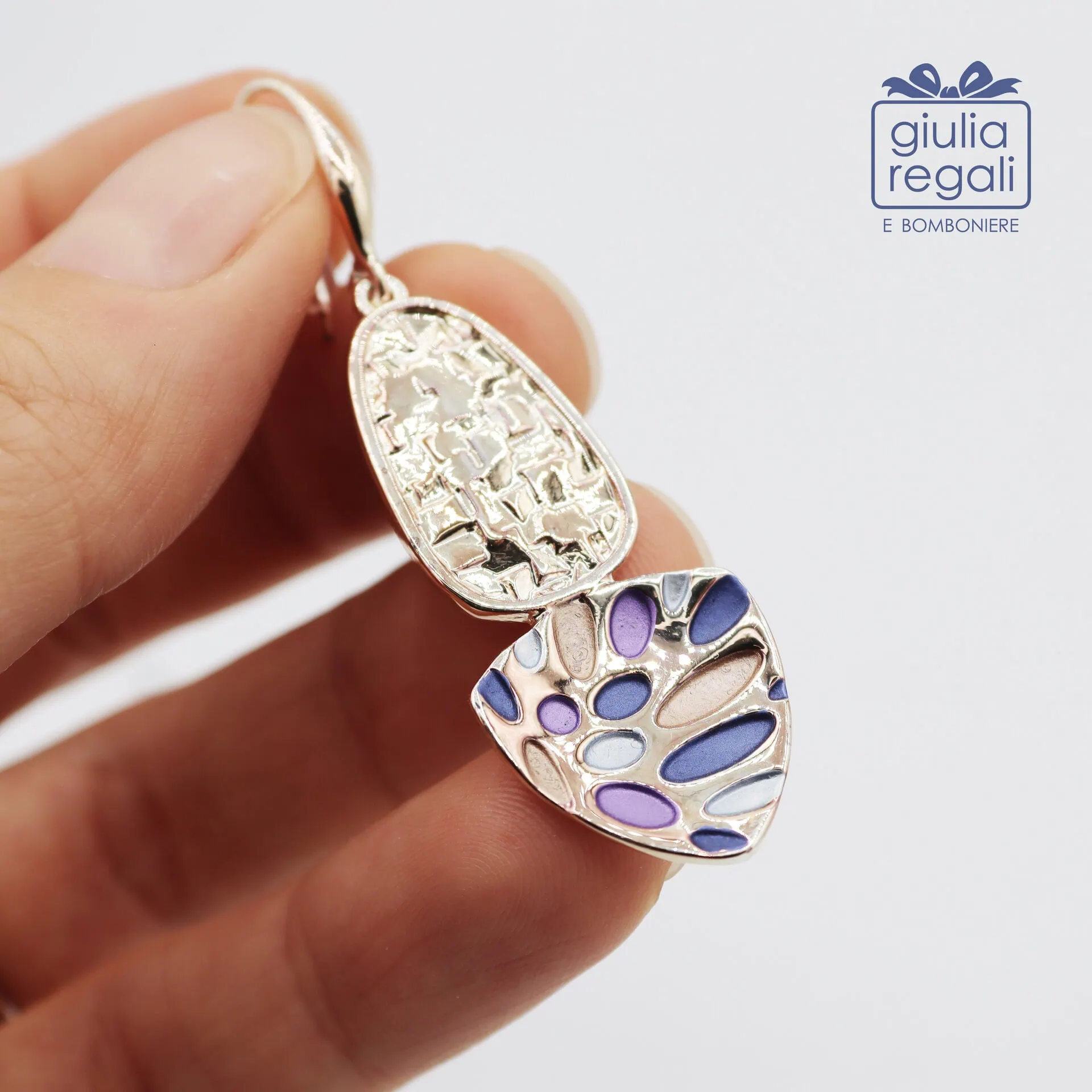 Orecchini Artigianali Anallergici pendenti smaltati di colore blu, celeste e lilla. In metallo martellato argentato.