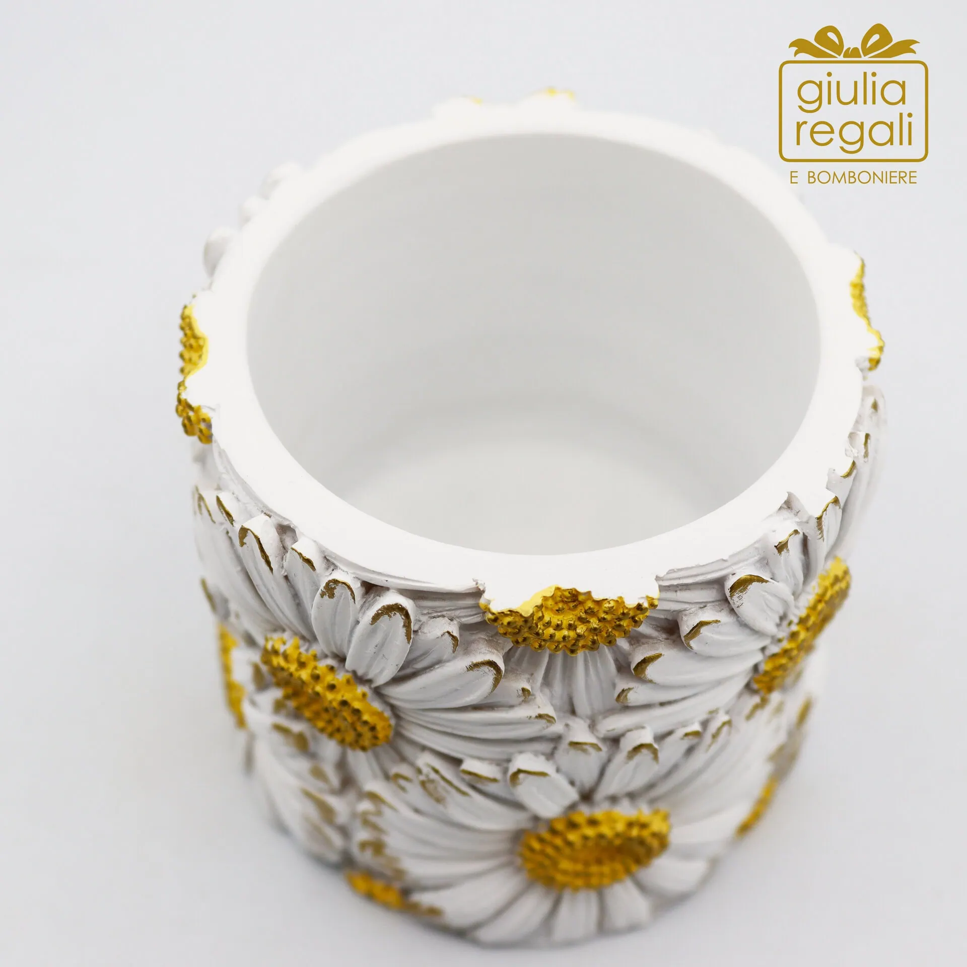 Portacandela decorativo in poliresina con margherite in rilievo, utilizzabile anche come portavaso o portapenne. Waterproof. Shopper trasparente con manici inclusa. Diametro 8,7 cm, altezza 7,7 cm.
