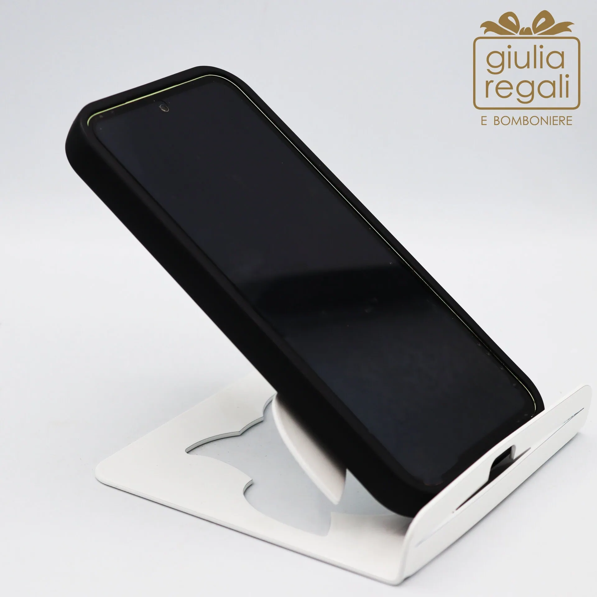 Portacellulare e porta tablet con inserto in legno a forma di gufo e base in metallo bianco. Un accessorio pratico ed elegante per tenere lo smartphone o il tablet sempre in posizione comoda su scrivania, comodino o piano di lavoro.