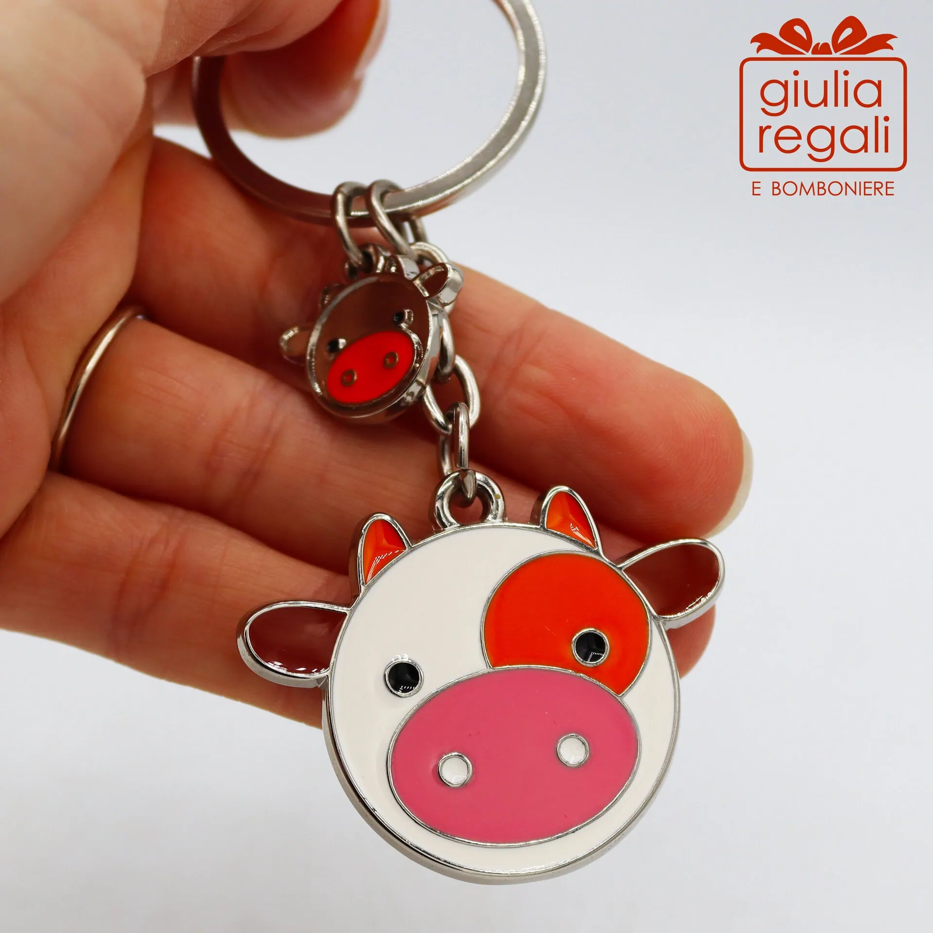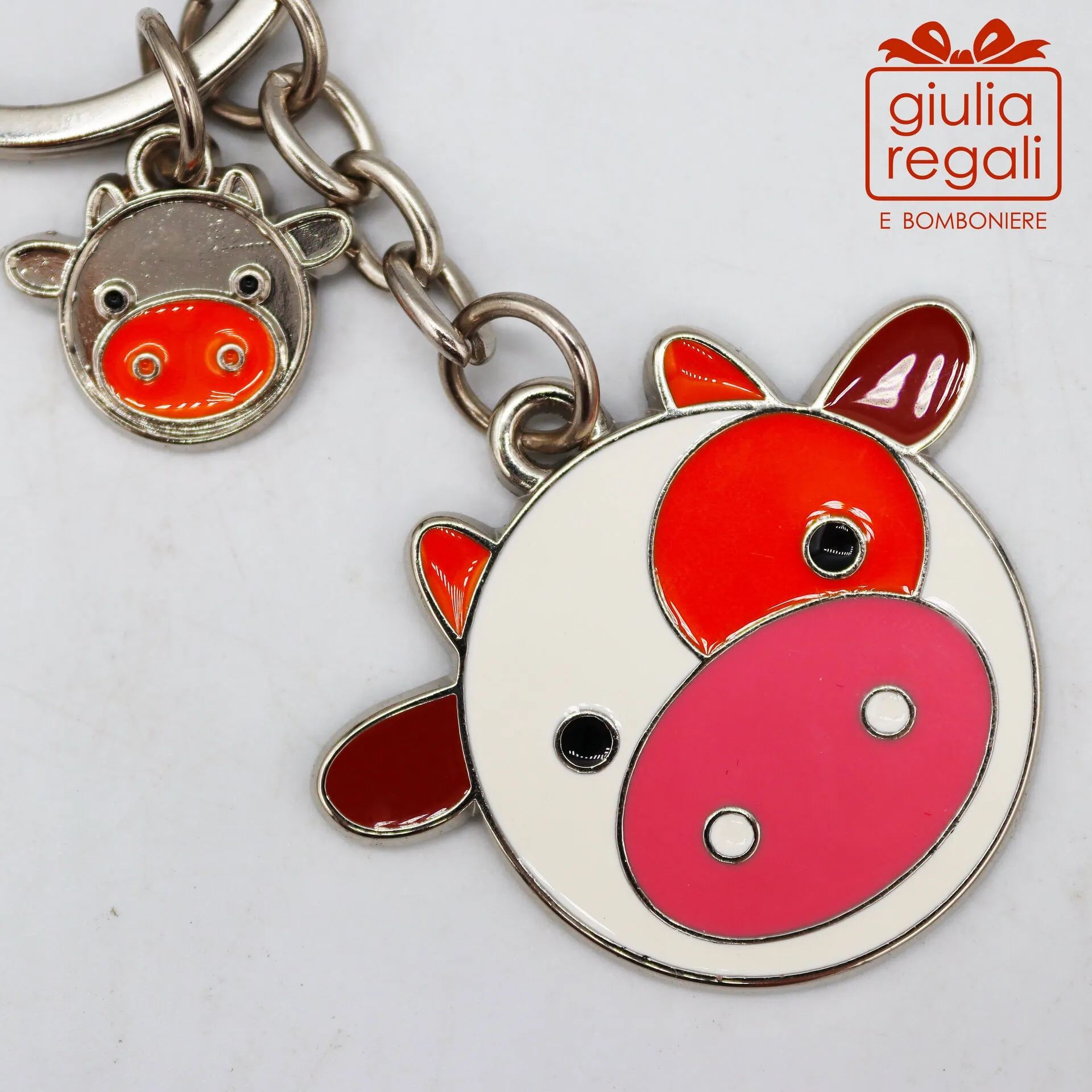 Portachiavi a forma di mucca con finitura smaltata colorata.