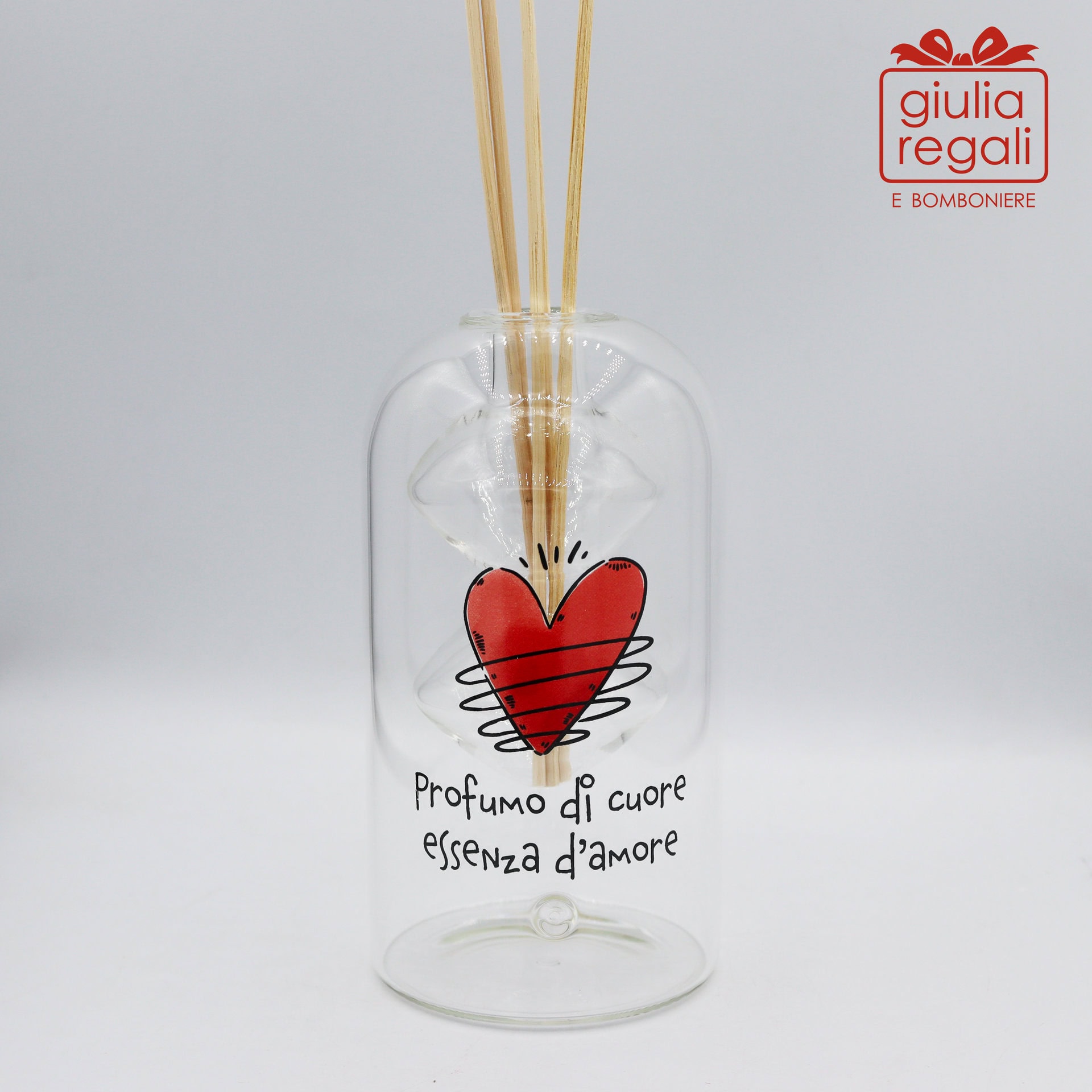 Profumatore ambiente in vetro trasparente, decorato con delicati cuoricini e scritta “Profumo di cuore, essenza d’amore”, appartenente alla linea Amici di Cuorematto. Un oggetto dal forte valore simbolico, pensato come bomboniera solidale o idea regalo per matrimoni, comunioni, anniversari ed eventi speciali.