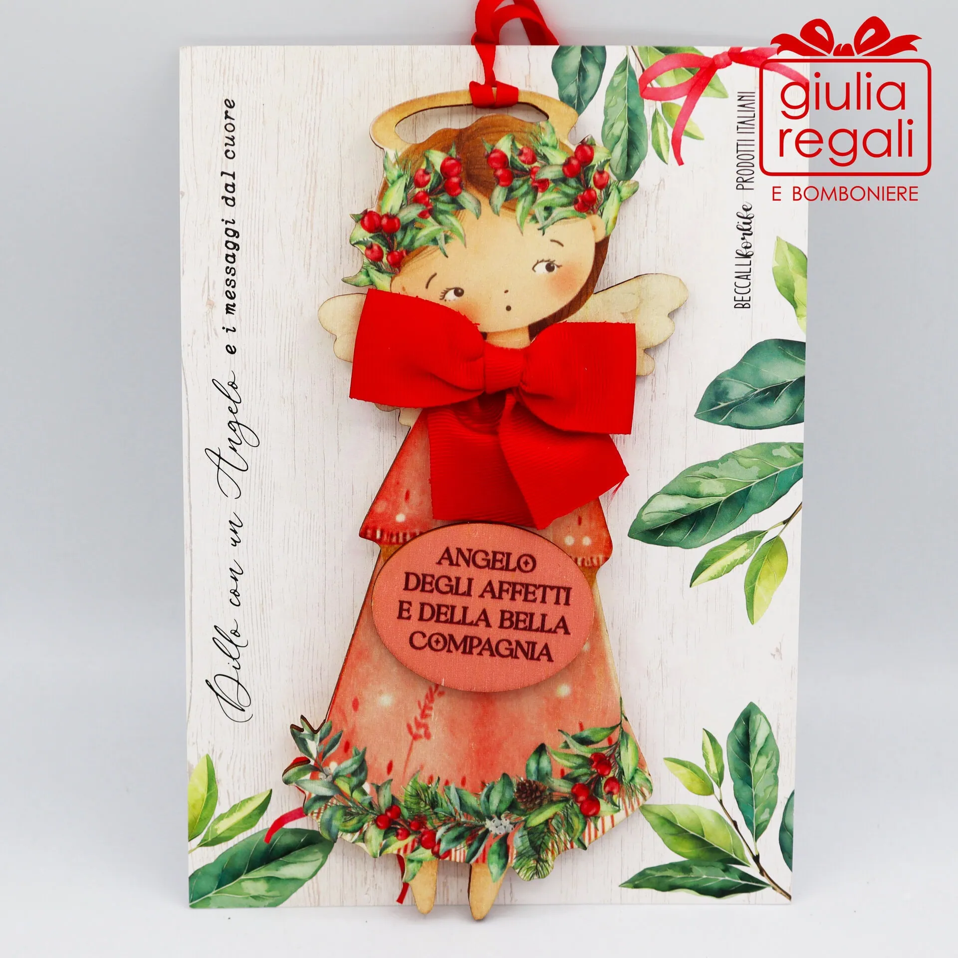 Dolcissima sagoma in legno con angioletto, decorata con una grafica natalizia delicata e arricchita da una scritta dedicata: “Angelo degli Affetti e della Bella Compagnia