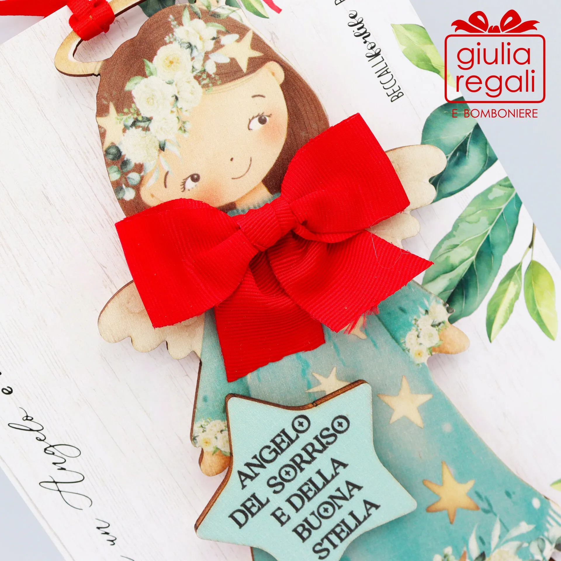 Dolcissima sagoma in legno con angioletto, decorata con una grafica natalizia delicata e arricchita da una scritta dedicata: “Angelo del Sorriso e della Buona Stella