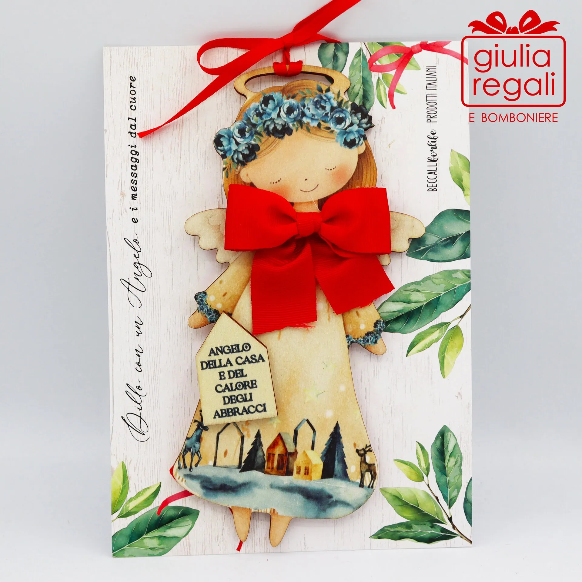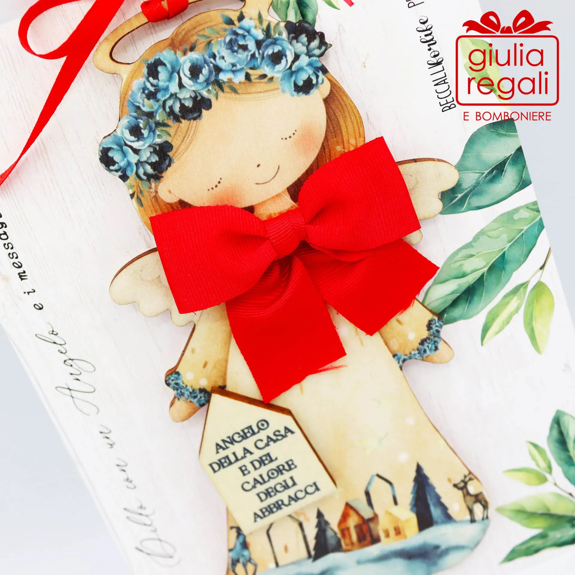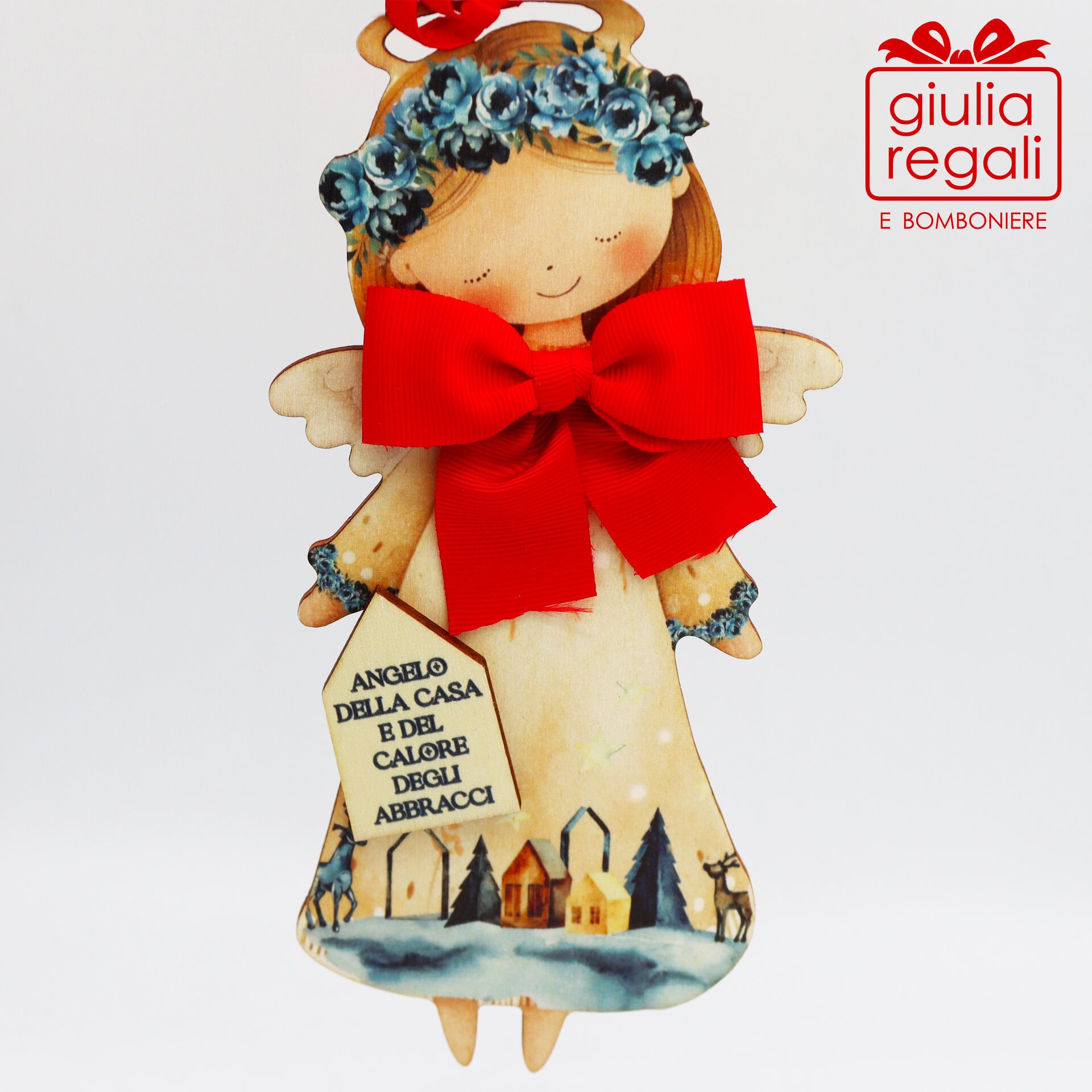 Dolcissima sagoma in legno con angioletto, decorata con una grafica natalizia delicata e arricchita da una scritta dedicata: “Angelo della Casa e del Calore degli Abbracci