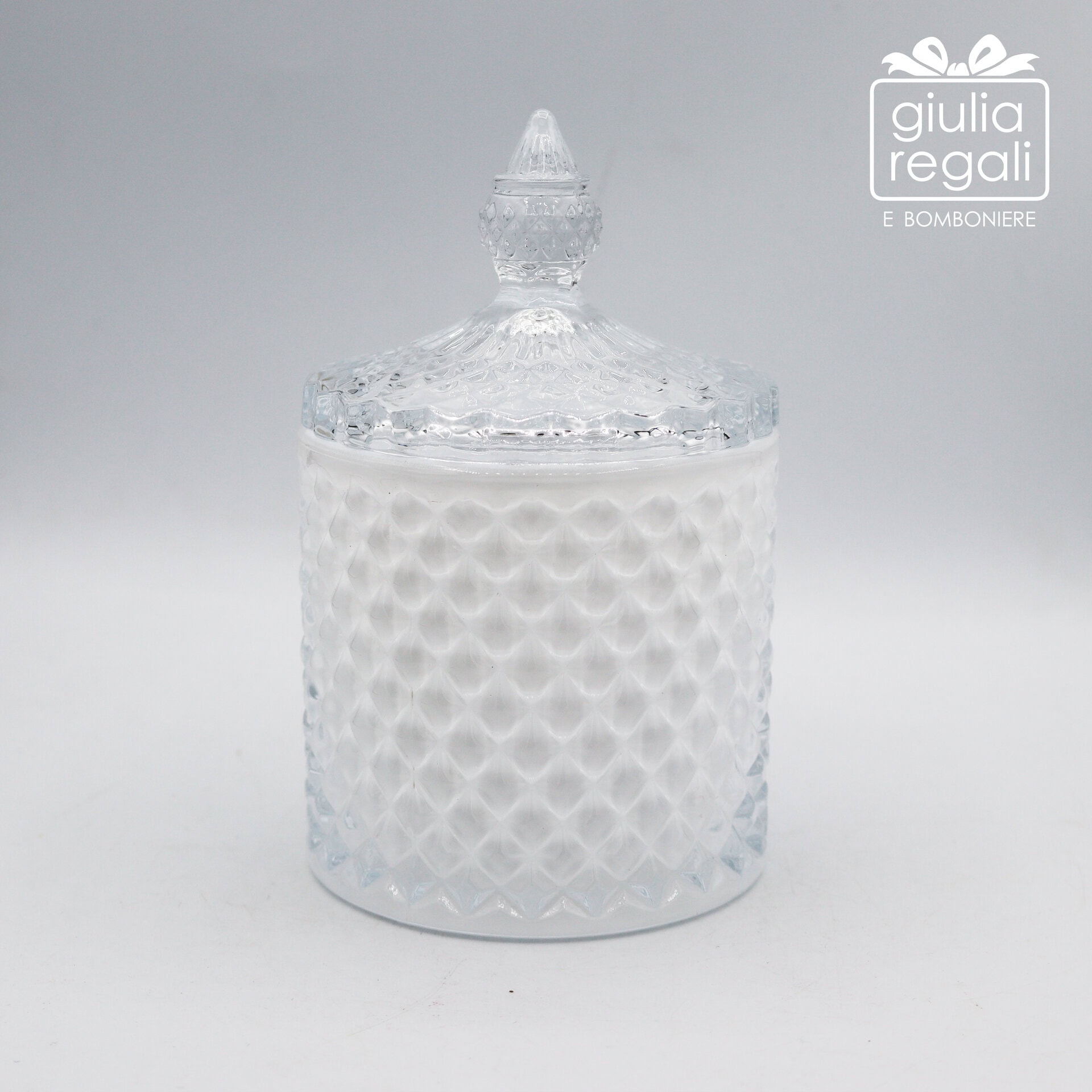 Scatola cilindrica in vetro con coperchio decorato – 8,5×13 cm