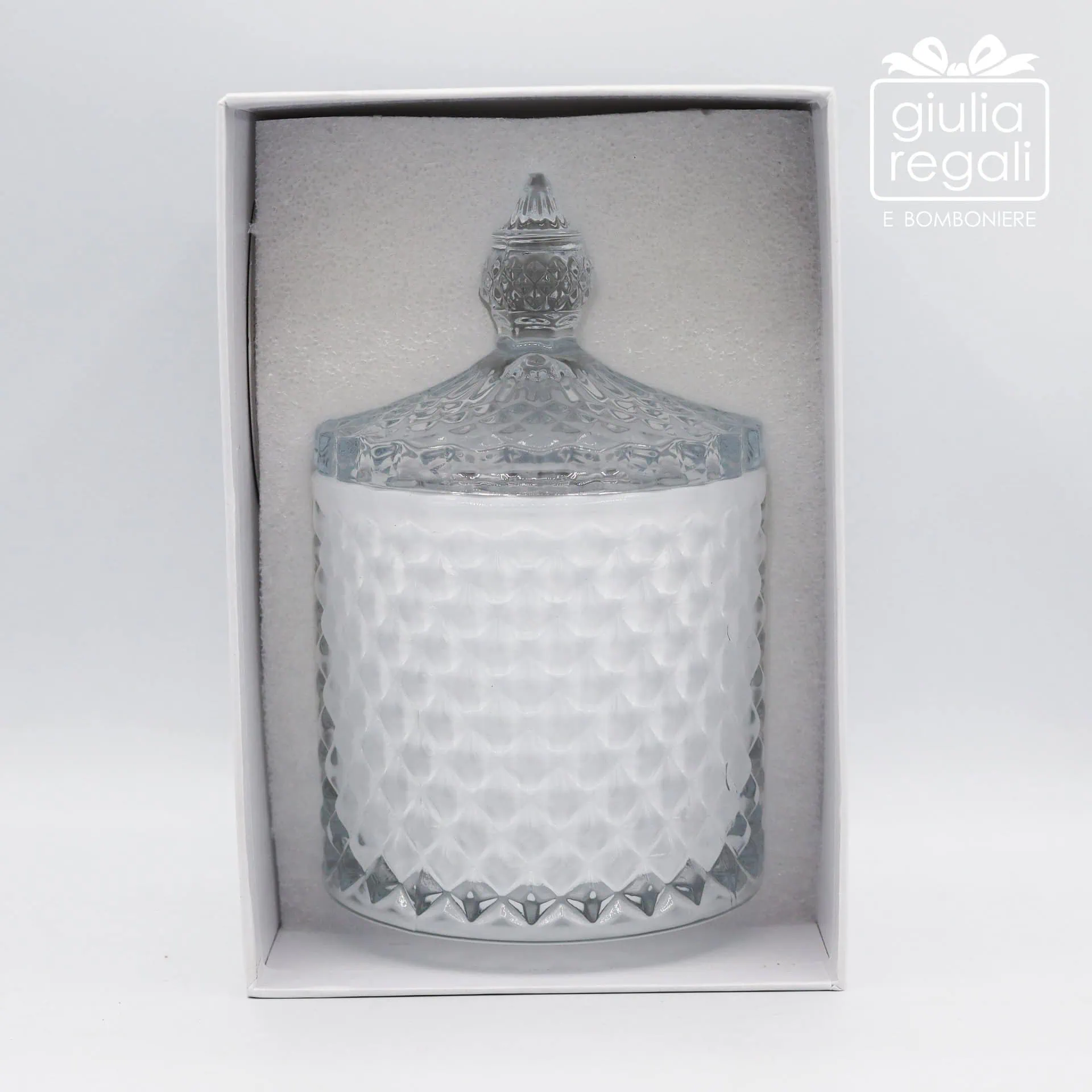 Scatola cilindrica in vetro con coperchio decorato, elegante e luminosa. Fornita con scatola in cartone rigido e interno sagomato. Dimensioni: Ø 8,5 cm × altezza 13 cm.