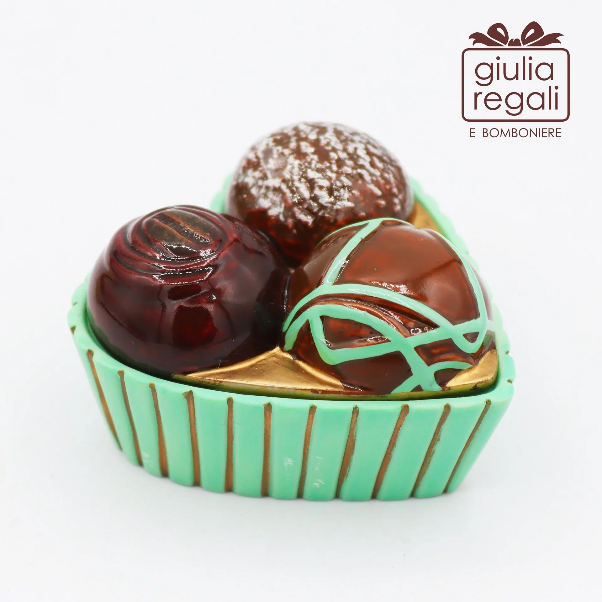 Scatolina a forma di cuore in porcellana decorata a mano con pasticcini in miniatura.