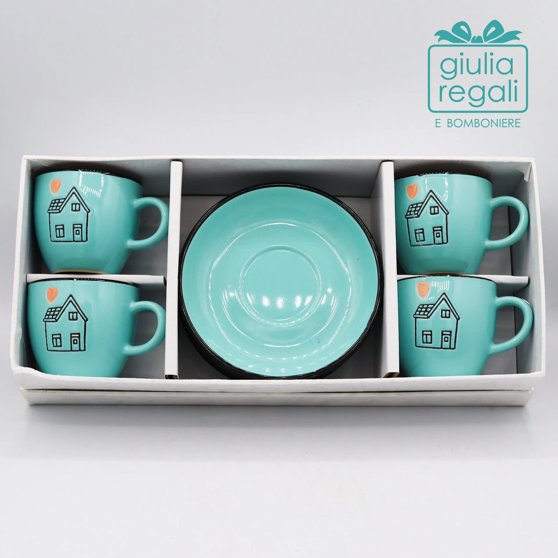 Delicato set composto da 4 tazzine da caffè con piattino coordinato in ceramica color acqua marina, impreziosite da un dolce decoro con casetta e cuore. Perfette per la colazione o per servire il caffè con stile.