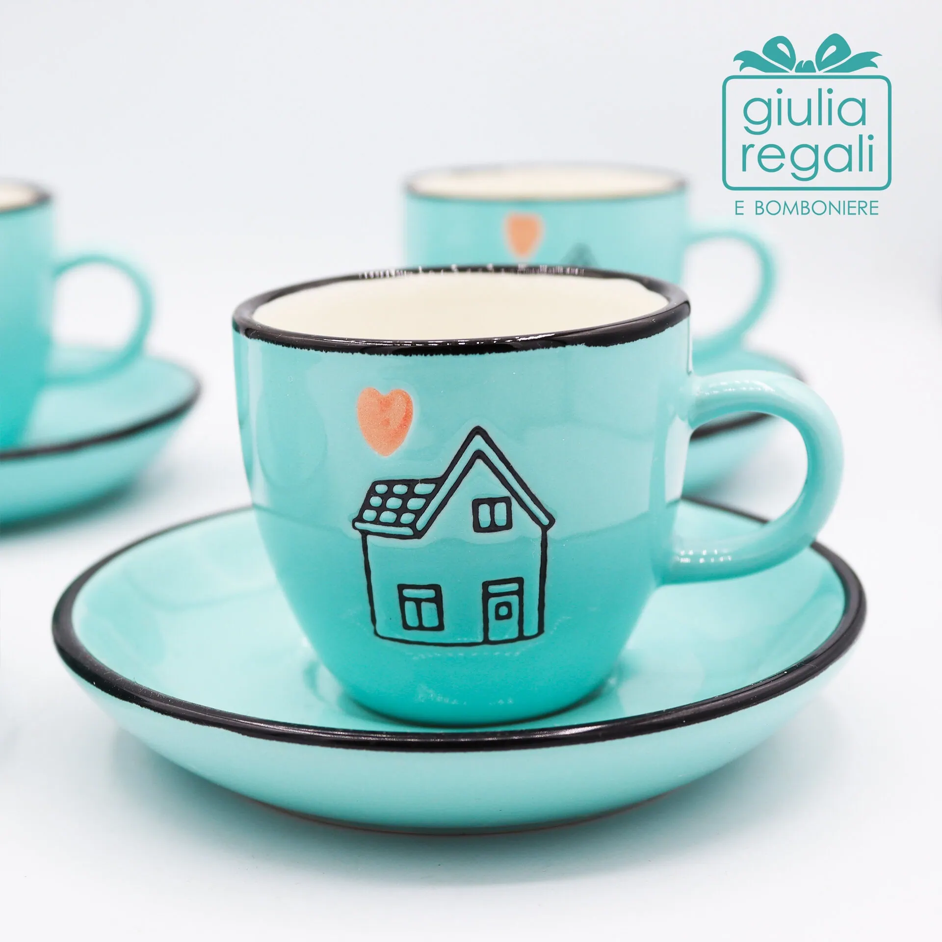 Set 4 tazzine con piattino in ceramica acqua marina – Decoro casetta con cuore