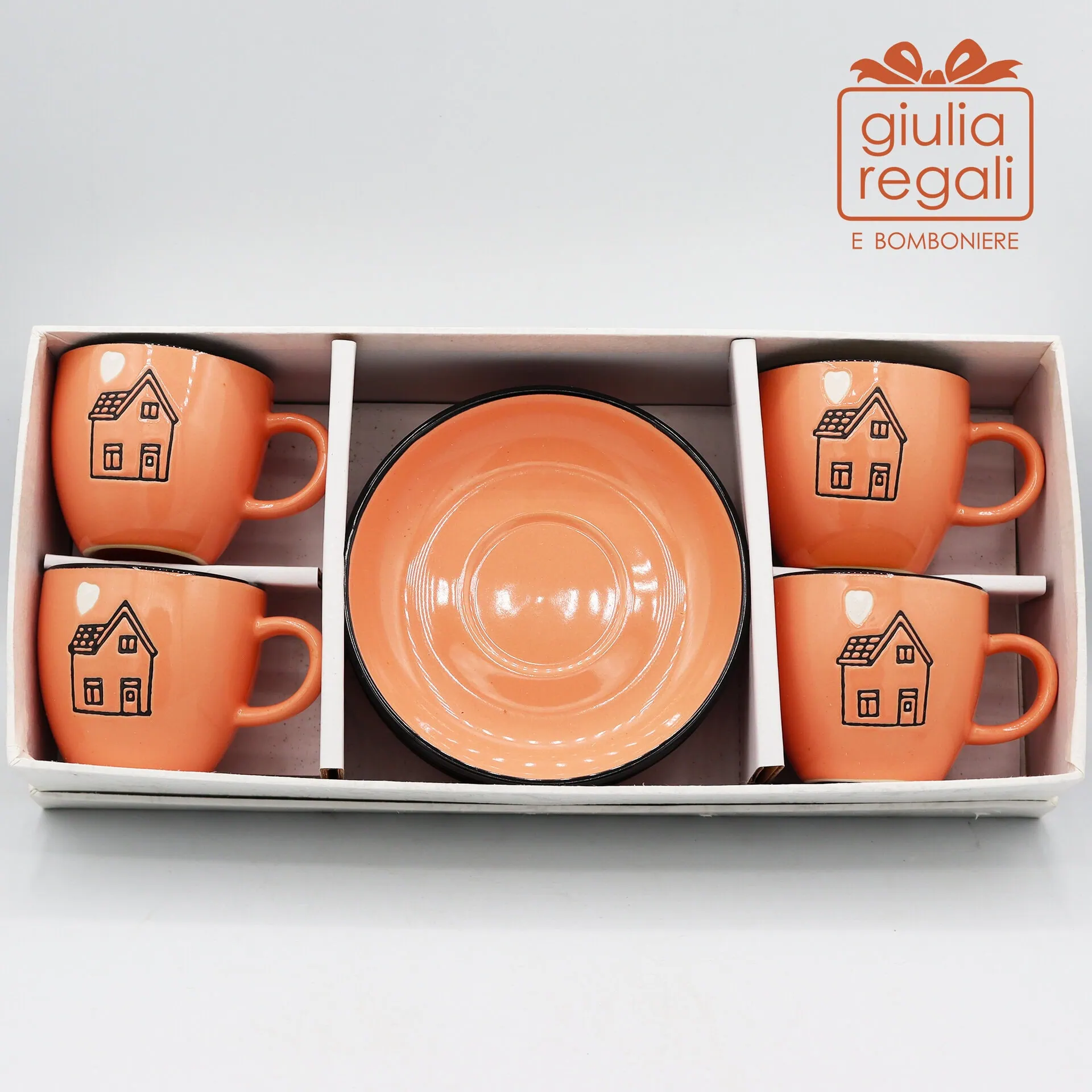 Le 4 tazzine in ceramica color pesca sono decorate con una piccola casetta stilizzata e un cuore arancio, un dettaglio semplice ma ricco di significato. Il bordo nero a contrasto definisce la forma e dona un tocco moderno e raffinato.