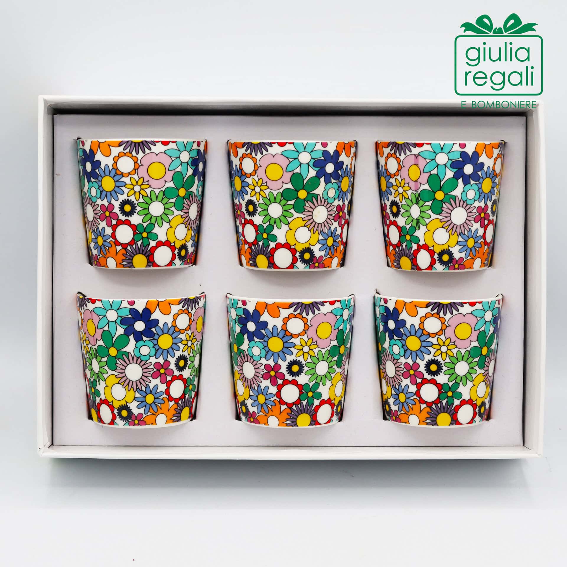 Il decoro floreale multicolore, ricco di fiori stilizzati dai toni vivaci, rende ogni bicchierino originale e immediatamente riconoscibile, perfetto per chi ama una tavola creativa e fuori dagli schemi.