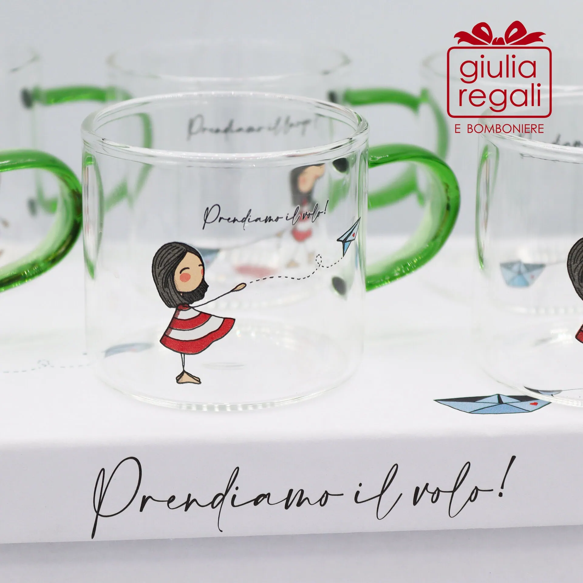 Questo set da 6 tazzine in vetro della linea La Tipa per Cuorematto è decorato con l’illustrazione della bambina in abito rosso e la frase “Prendiamo il volo!”, un invito a credere nei propri sogni e guardare avanti con entusiasmo.