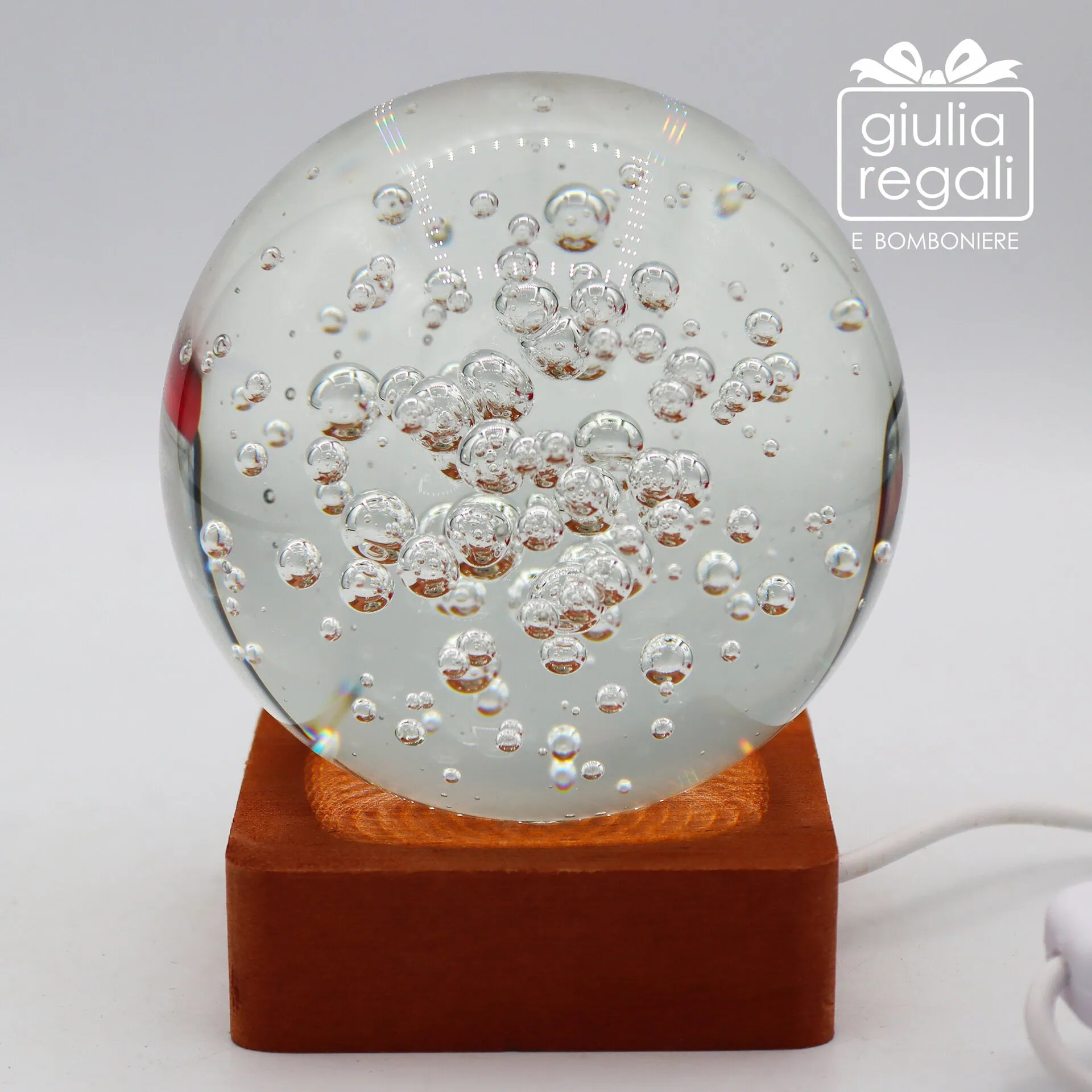 Sfera luminosa in cristallo con bolle e base LED
