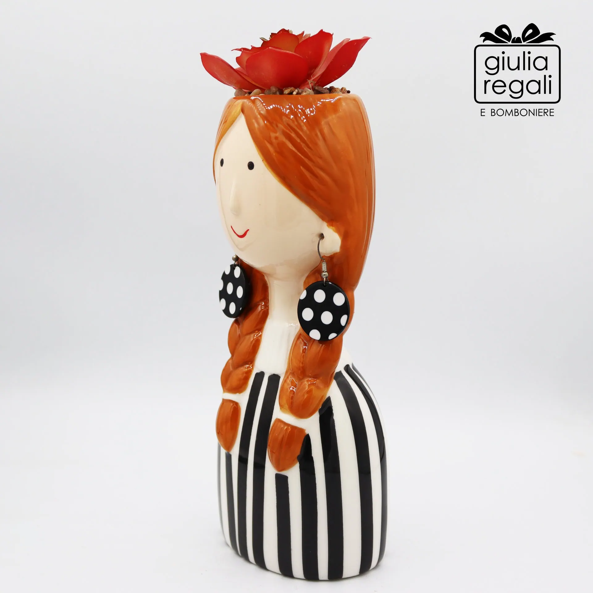 Vaso Girl con trecce rosse, orecchini e vestito a righe verticali. In ceramica, di dimensioni 25×8 cm. Questo originale vaso è a forma di donna con orecchini contiene, nella parte alta della testa, una piantina grassa finta realistiche. Per arredare la propria casa con originalità e allegria, ma anche con stile.