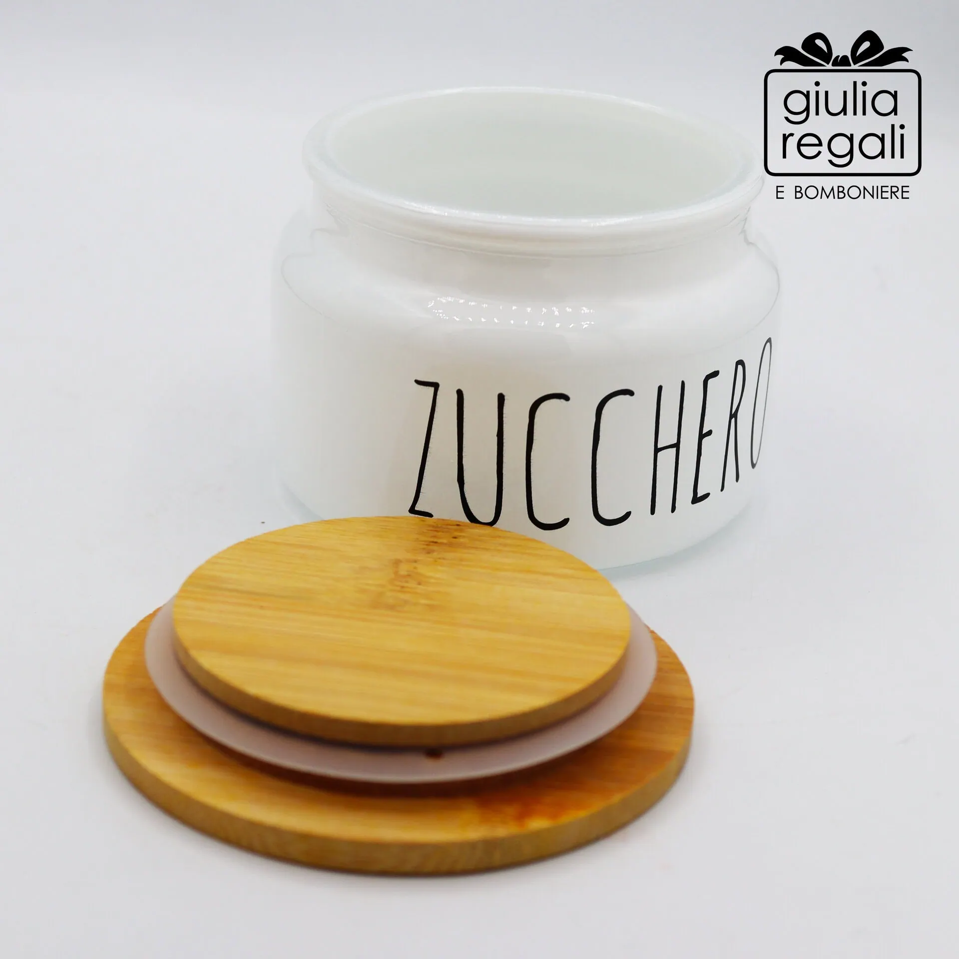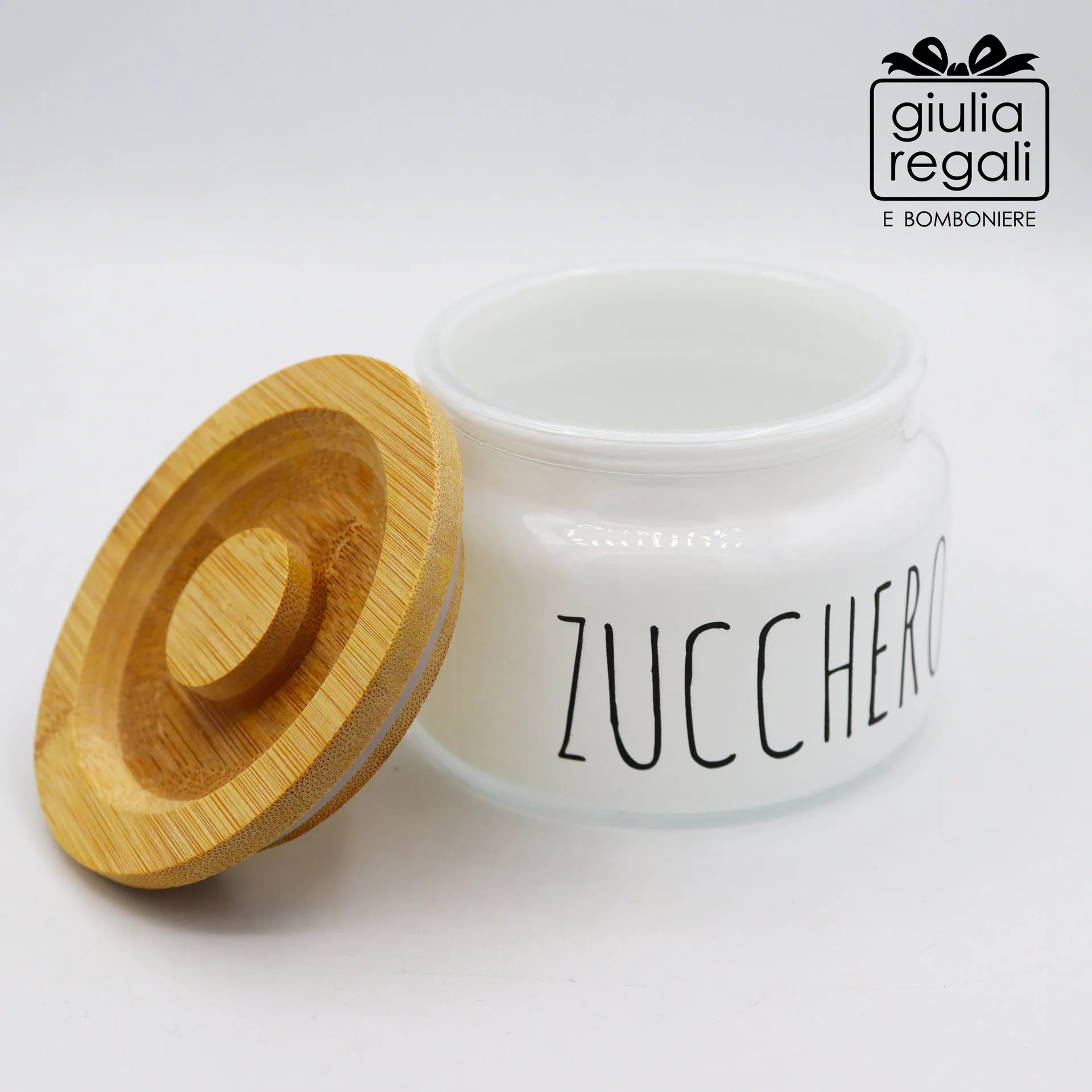 Zuccheriera in vetro con coperchio in legno e scritta “Zucchero”. Fornita in scatola regalo. Dimensioni: Ø 10 cm × altezza 7 cm. Bomboniera o regalo utile ed elegante.