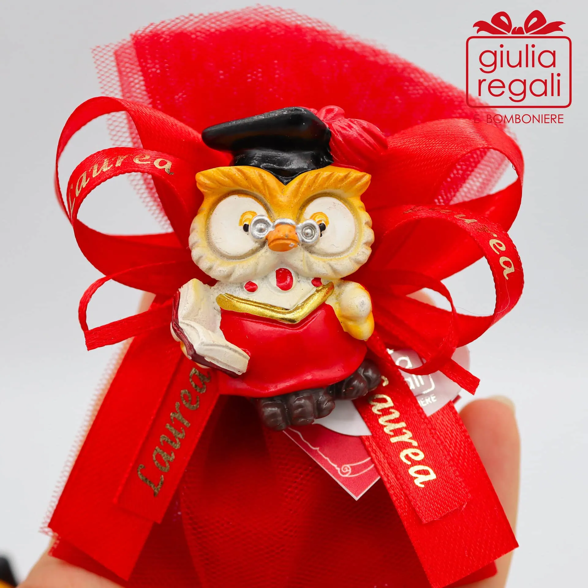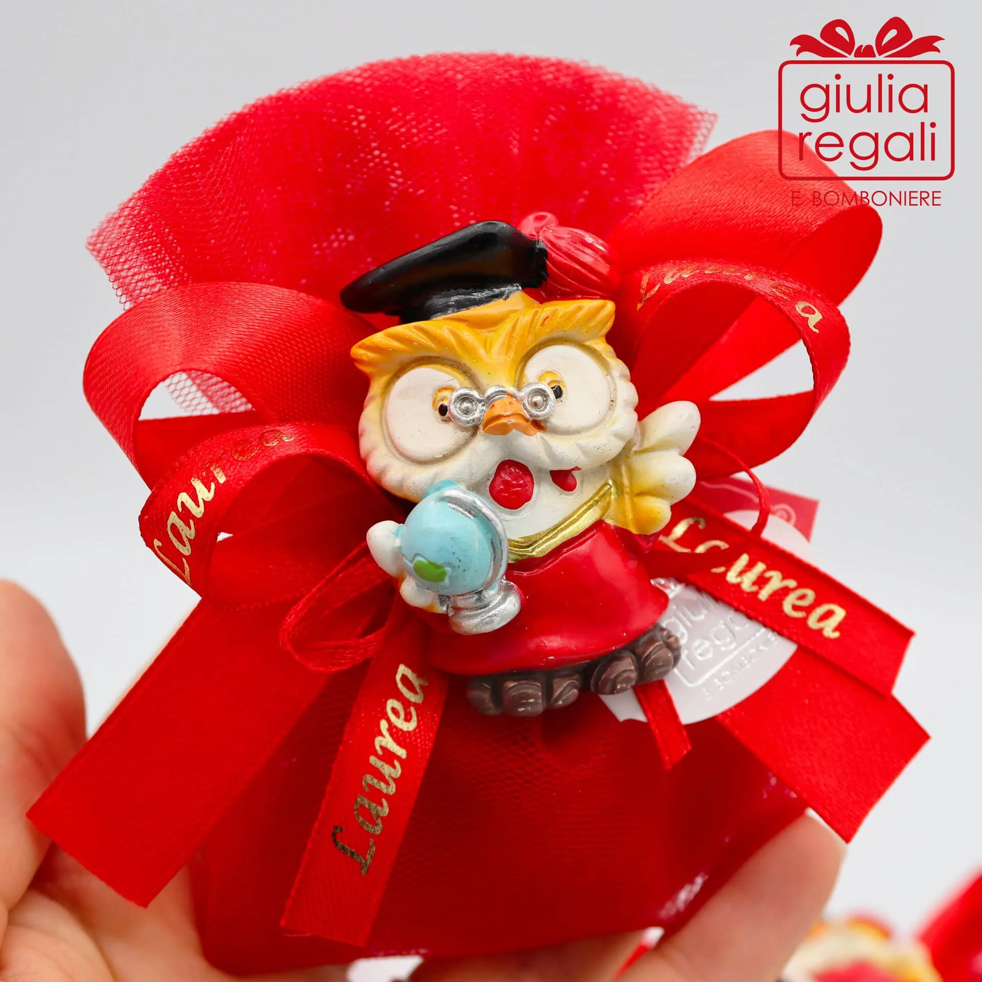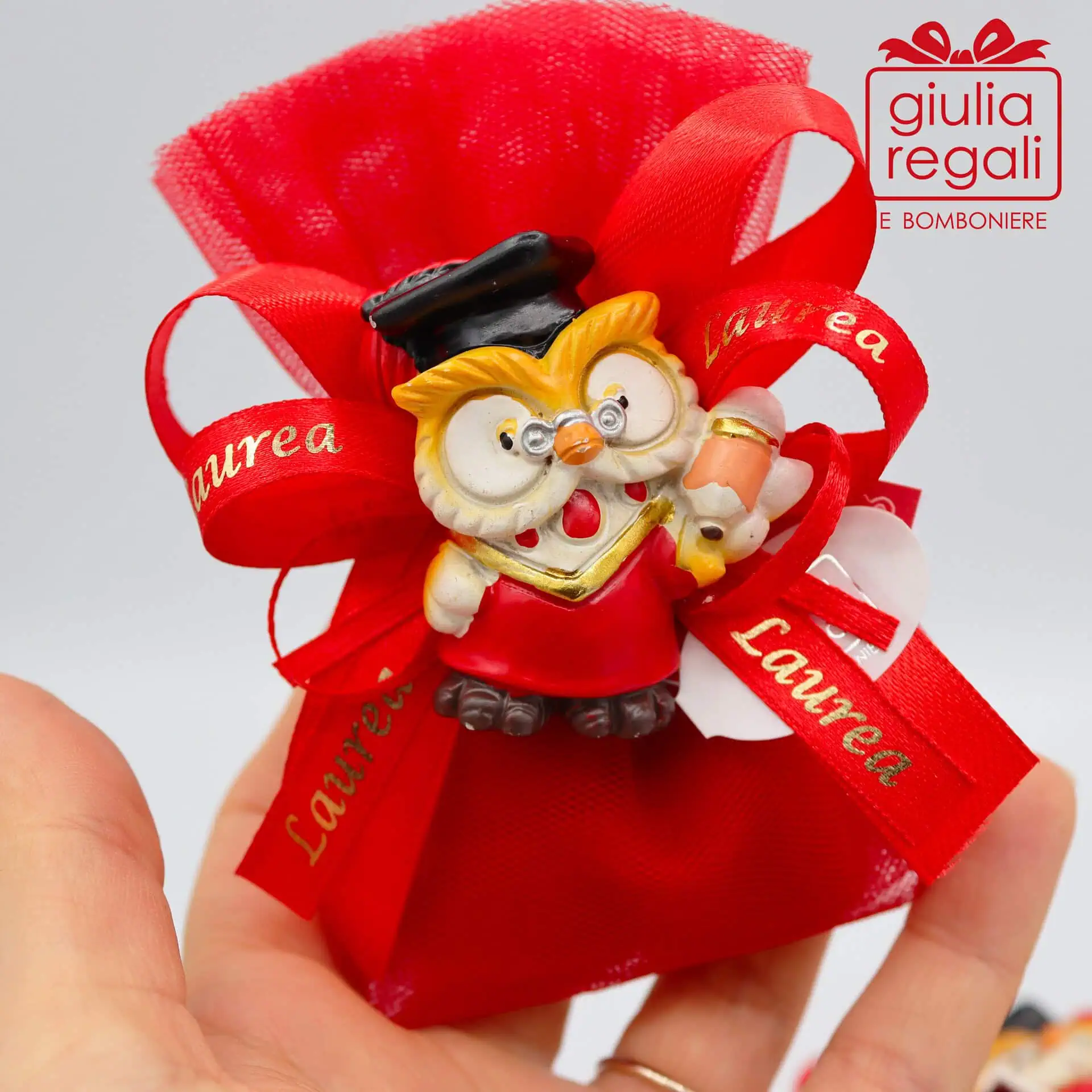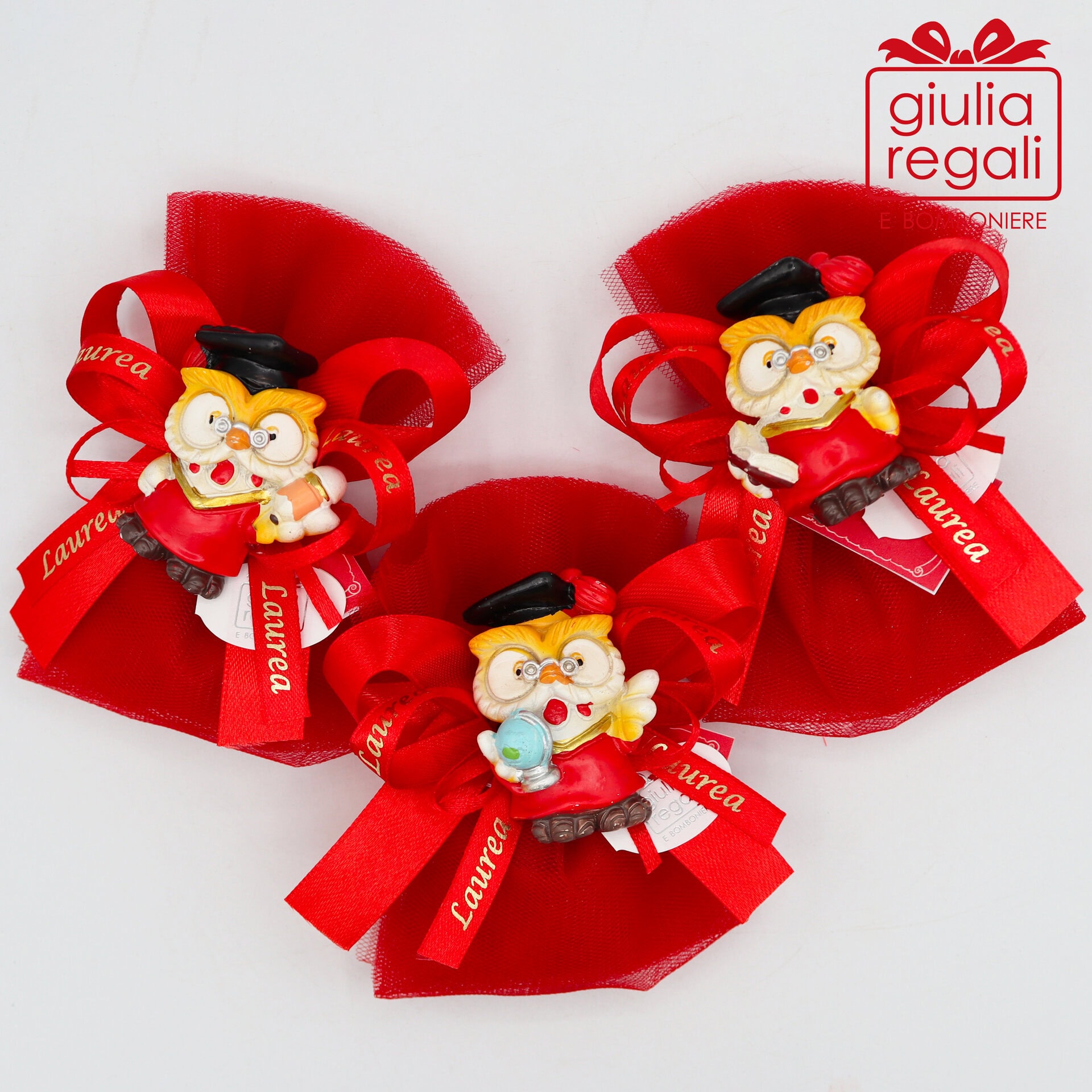 Bomboniere da laurea con gufi magnetici confezionati su sacchetto realizzato con due strati di tulle rosso, che contiene 5 confetti rossi e bigliettino personalizzato con nome della persona festeggiata e data della laurea. I due fiocchi sono in raso rosso e uno con scritta “Laurea”. I gufetti con calamita sono assortiti in 3 varianti diverse.
