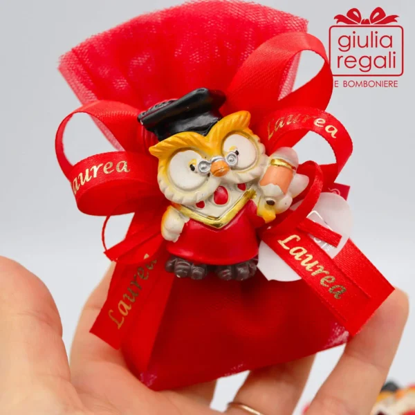 - Design: Forma di tocco (cappello da laurea) con nappa rossa