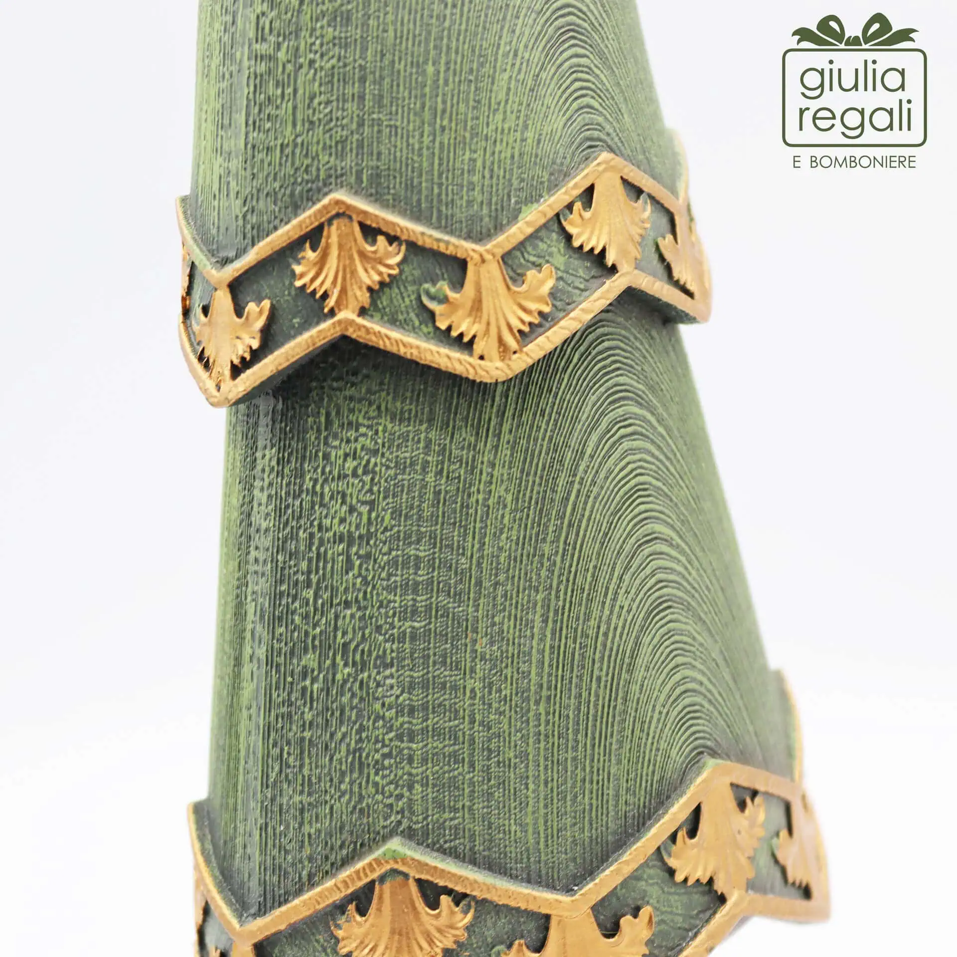 Albero decorativo natalizio in resina con dettagli dorati e base effetto legno. Elegante complemento d’arredo per le feste o idea regalo raffinata.