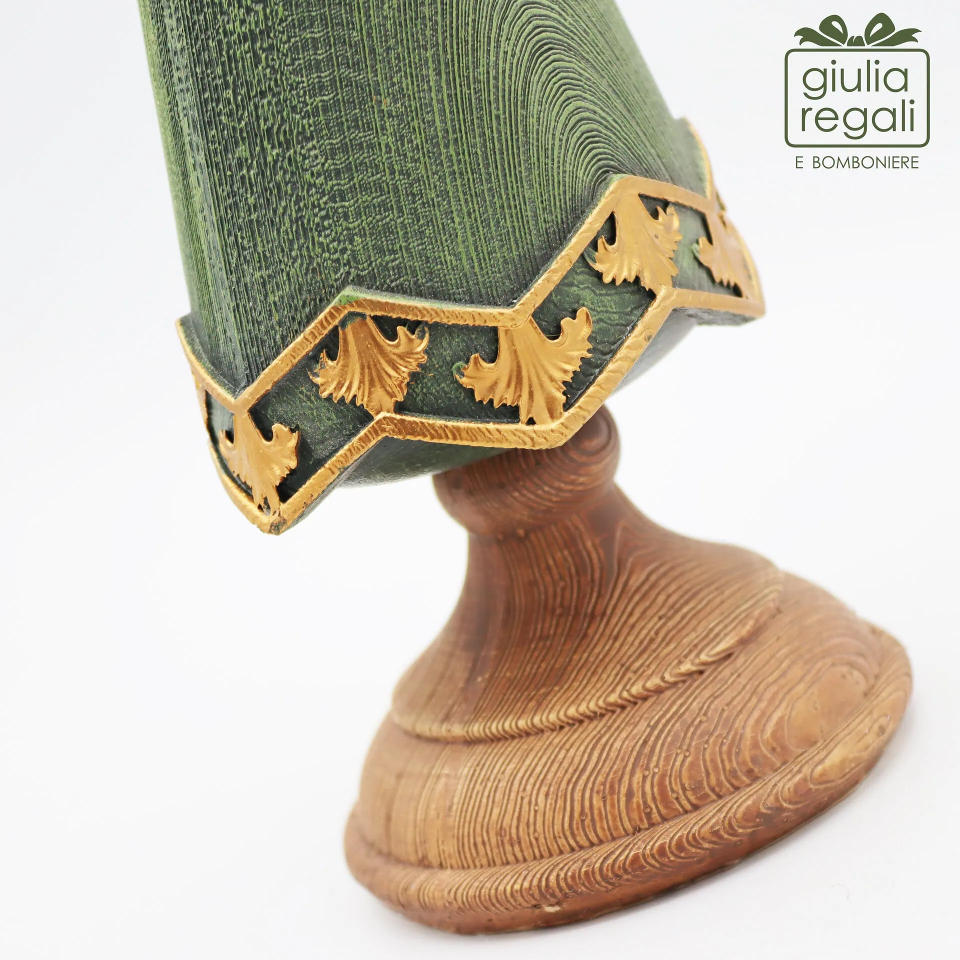 La superficie verde con effetto legno venato è impreziosita da dettagli dorati che richiamano motivi di foglie e decori classici, rendendolo un complemento raffinato per la casa durante il periodo delle feste.