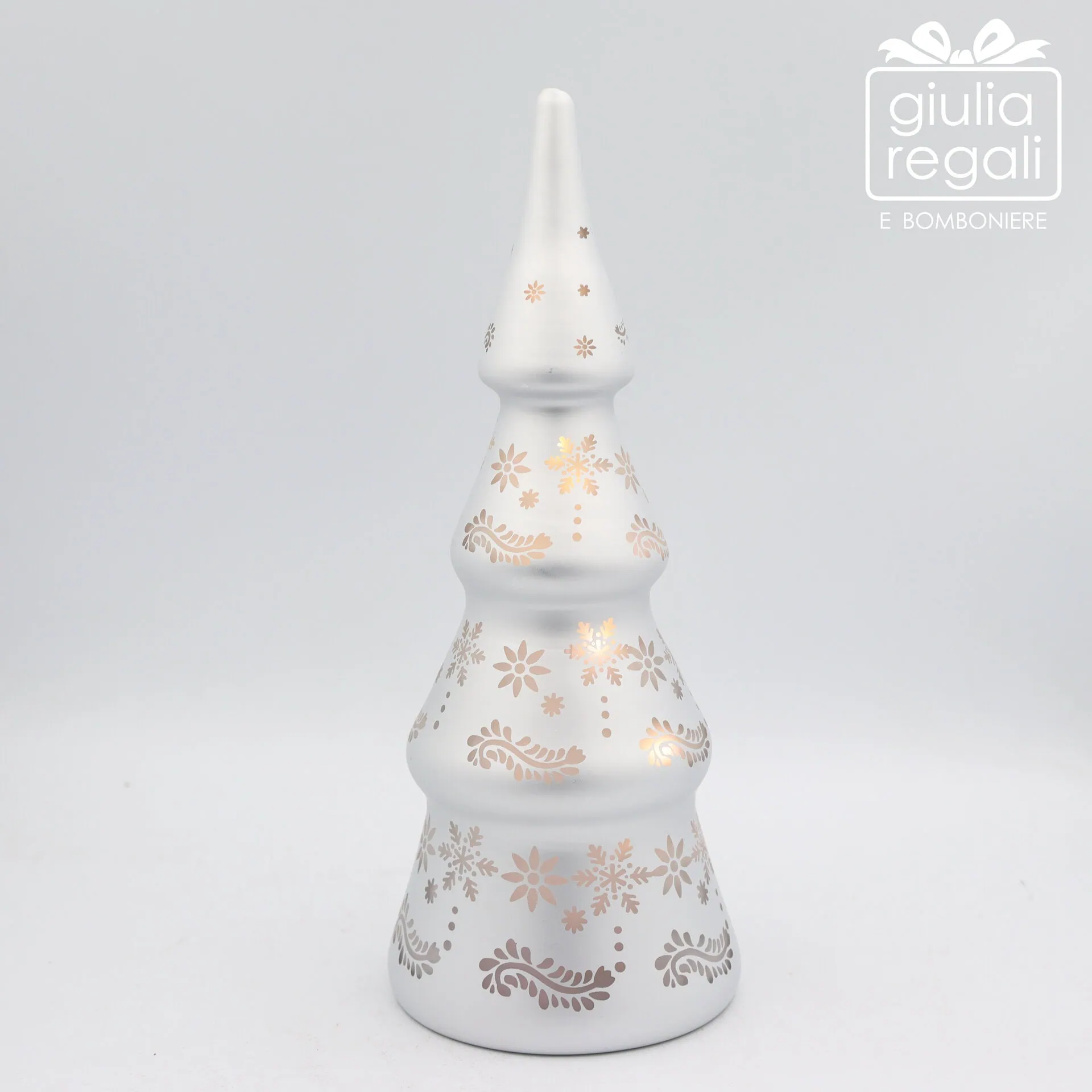 Albero di Natale luminoso in vetro bianco satinato con luce LED e scatola regalo elegante. Altezza 21 cm. Pile non incluse.
