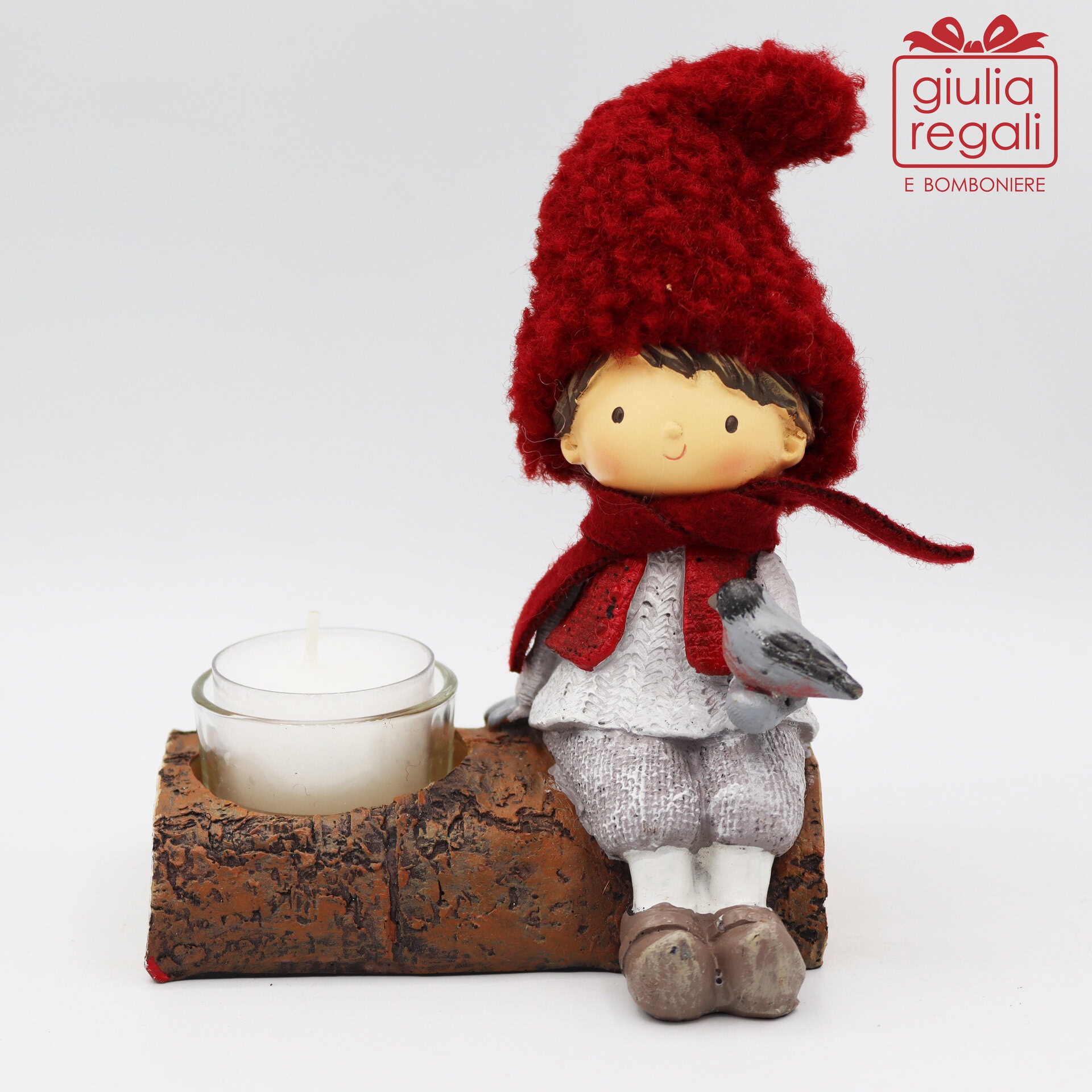 Dolcissimo portacandela natalizio con bimbo seduto su un tronco effetto legno, che tiene un piccolo uccellino in mano.