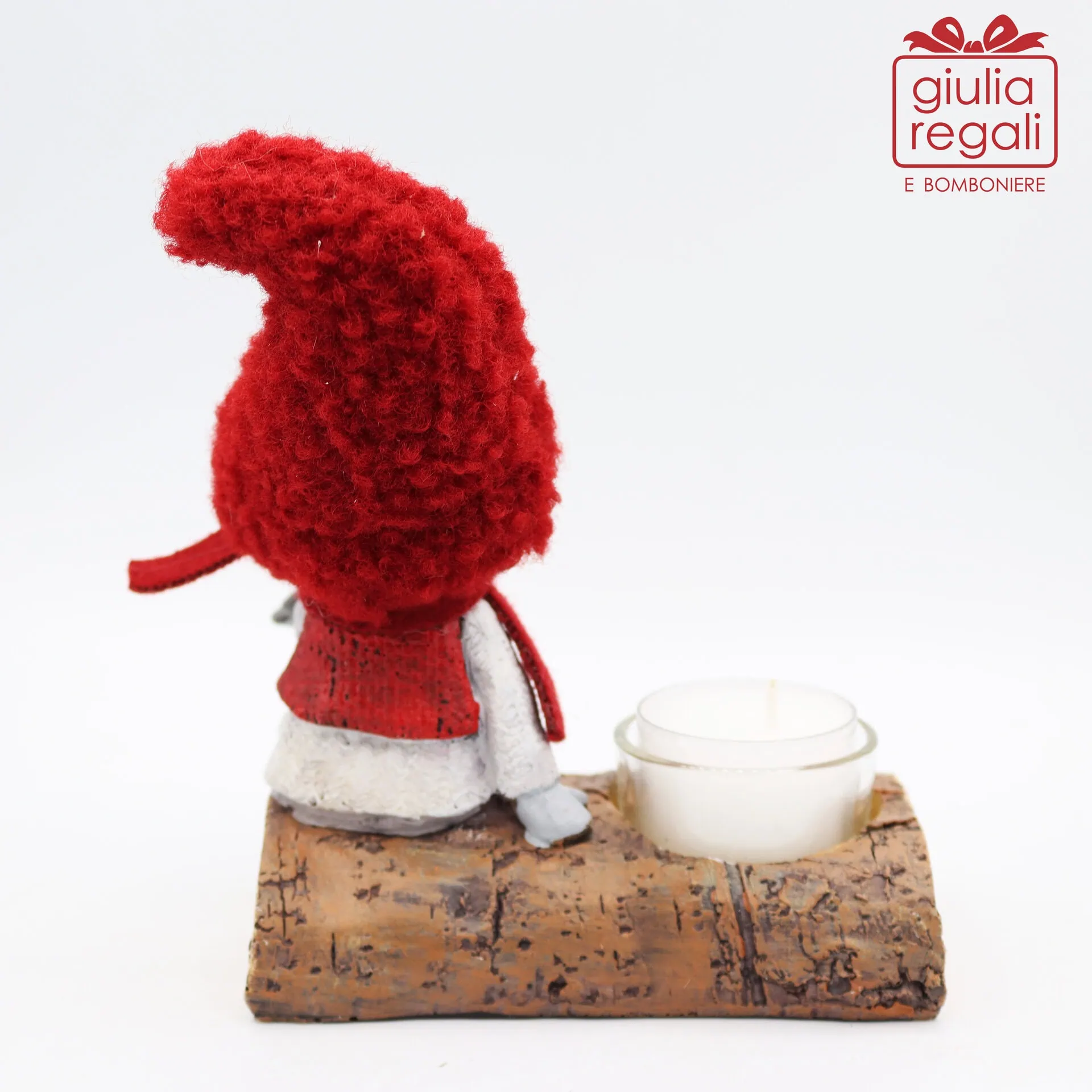 Portacandela natalizio con bimbo in resina e cappello rosso in lana, seduto su tronco effetto legno con candela tealight. Tenero decoro natalizio o idea regalo.