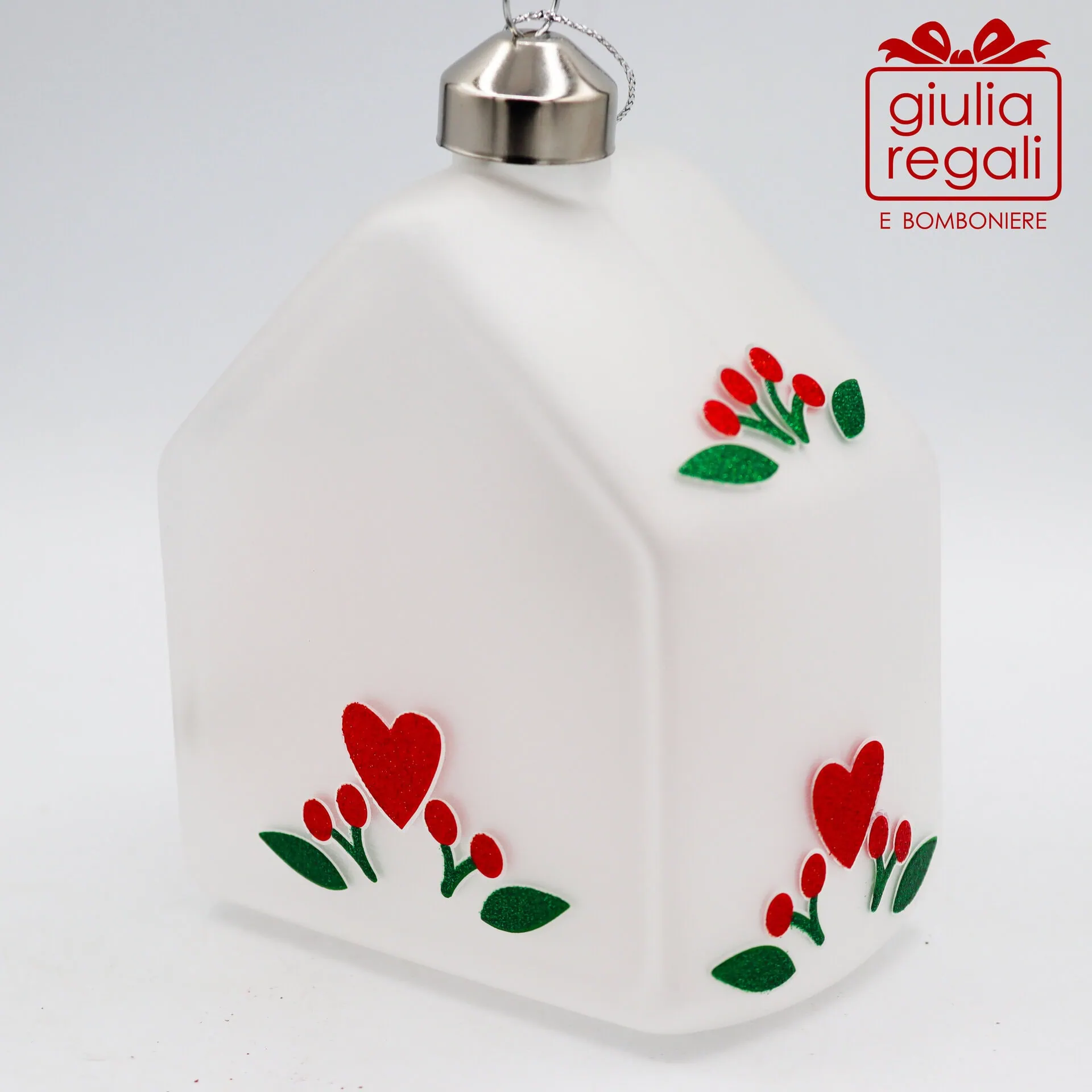 Delizioso addobbo natalizio a forma di casetta firmato WALD, realizzato in vetro con cura artigianale e dettagli dipinti nei toni caldi del Natale.