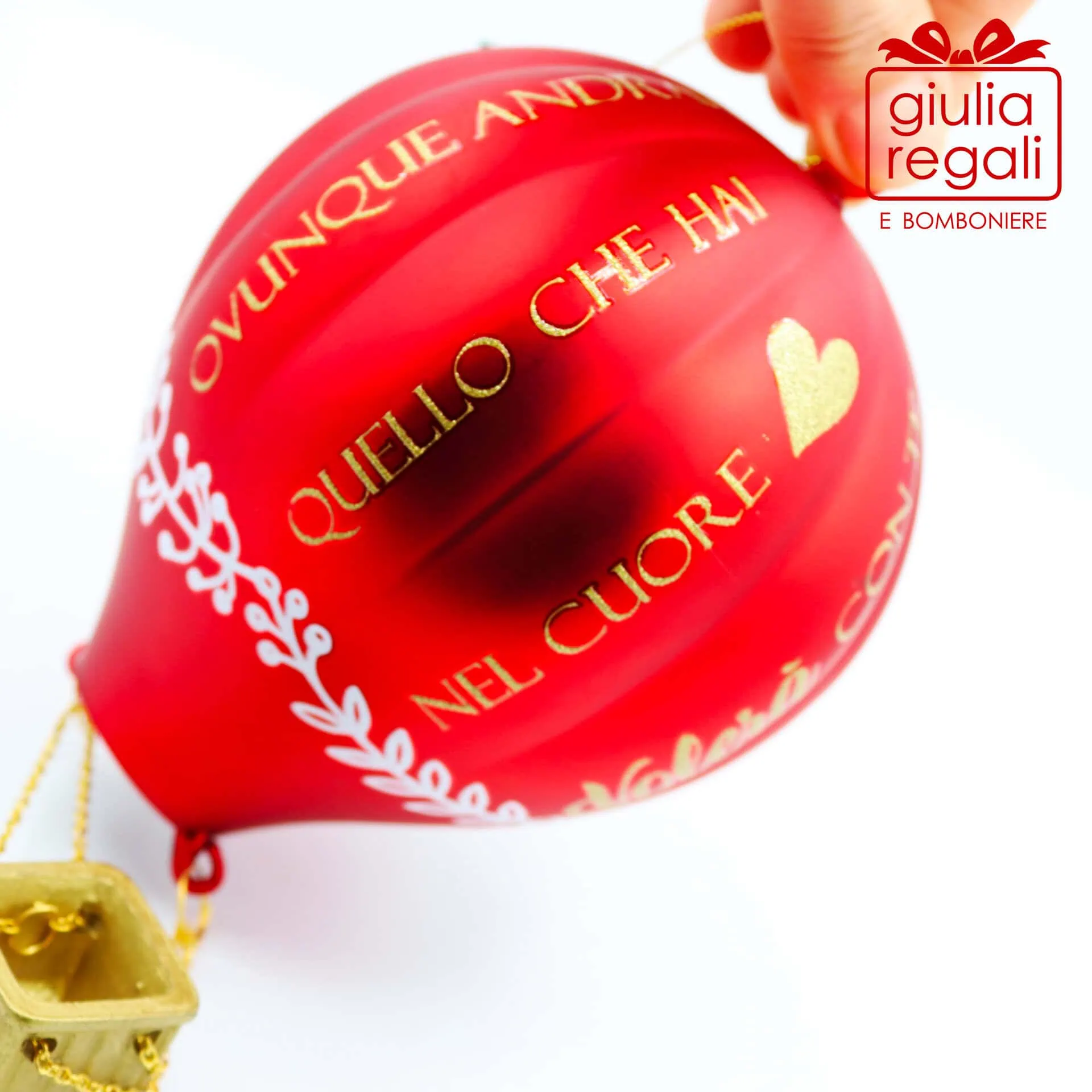 Decorazione natalizia WALD a forma di mongolfiera in vetro e metallo, con la frase “Ovunque andrai quello che hai nel cuore volerà con te”, adatta da appendere e confezionata in elegante scatola regalo.