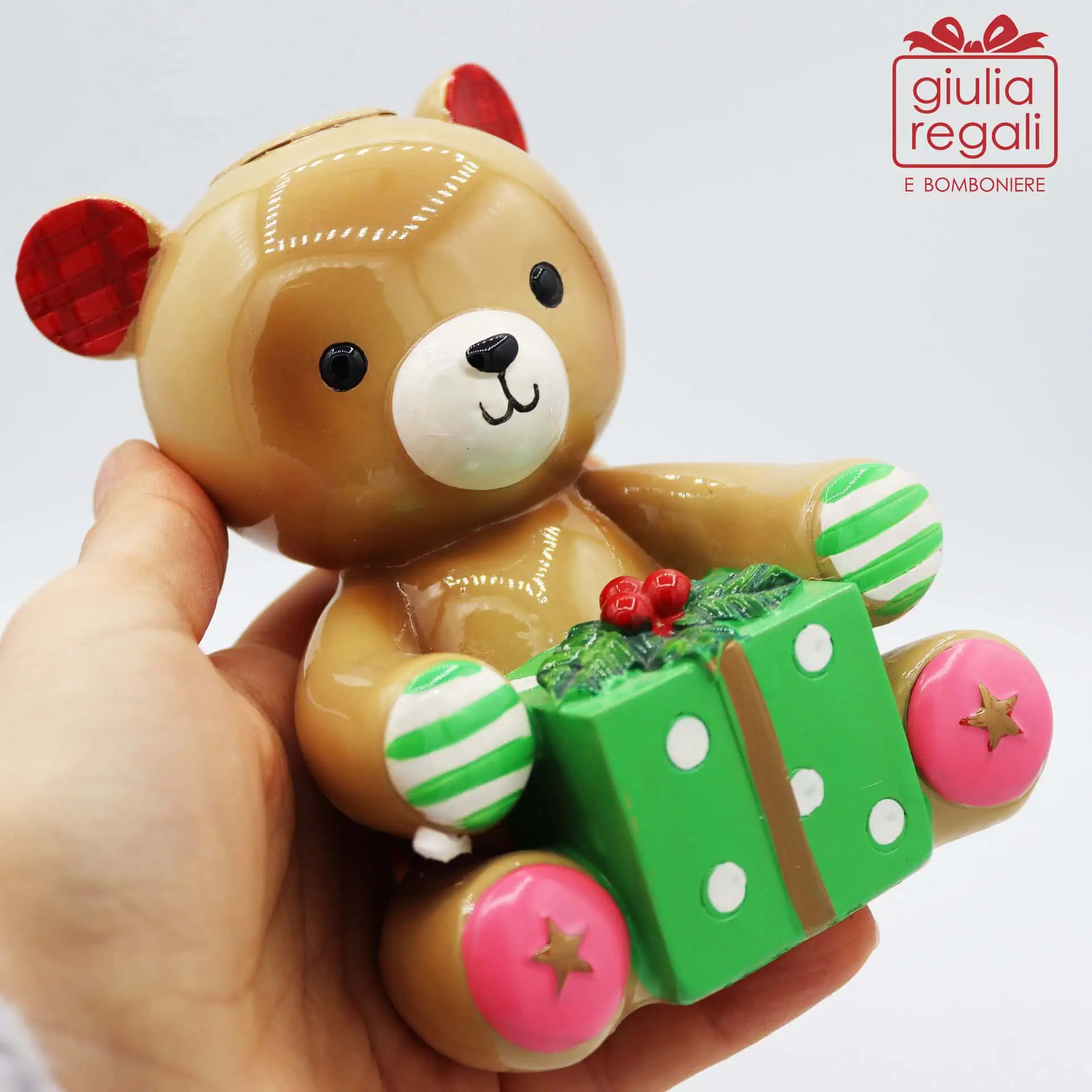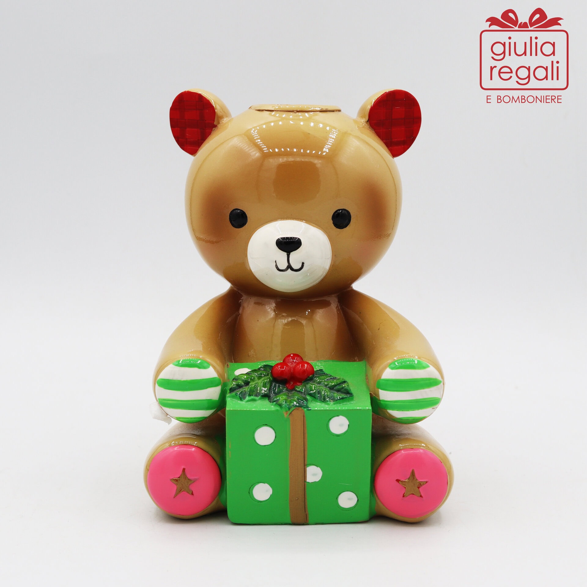 Portacandela natalizio in resina a forma di orsetto con pacco regalo verde e foro per candela lunga. Altezza 13 cm.