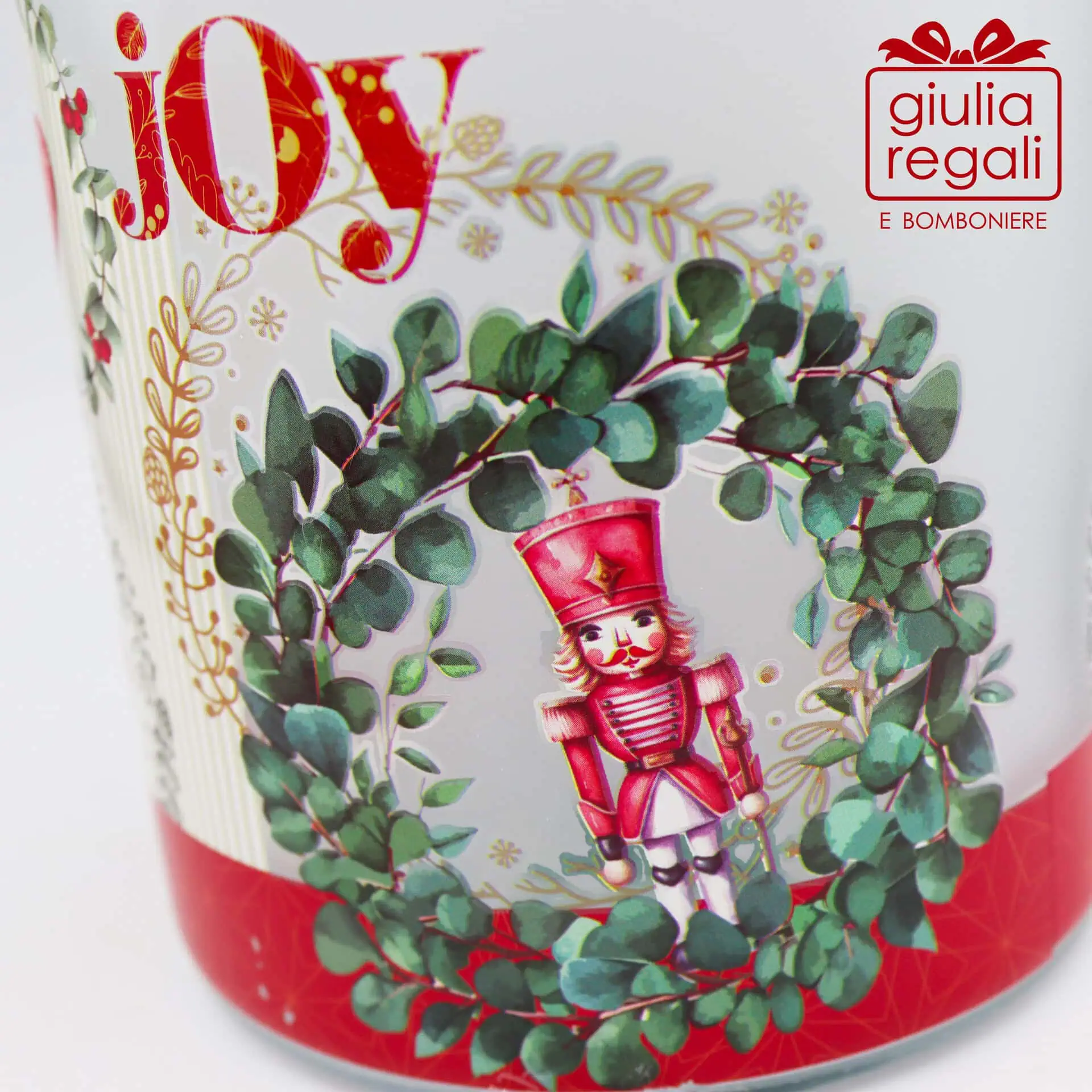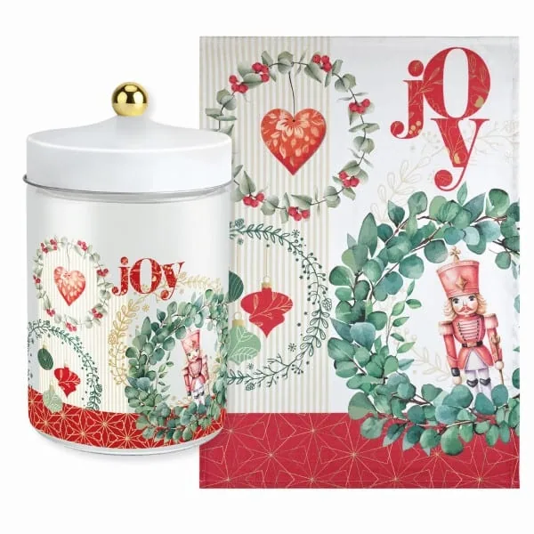 Set Wald con barattolo in ceramica e strofinaccio a tema ghirlande e soldatino schiaccianoci. Elegante idea regalo per la cucina con confezione illustrata.