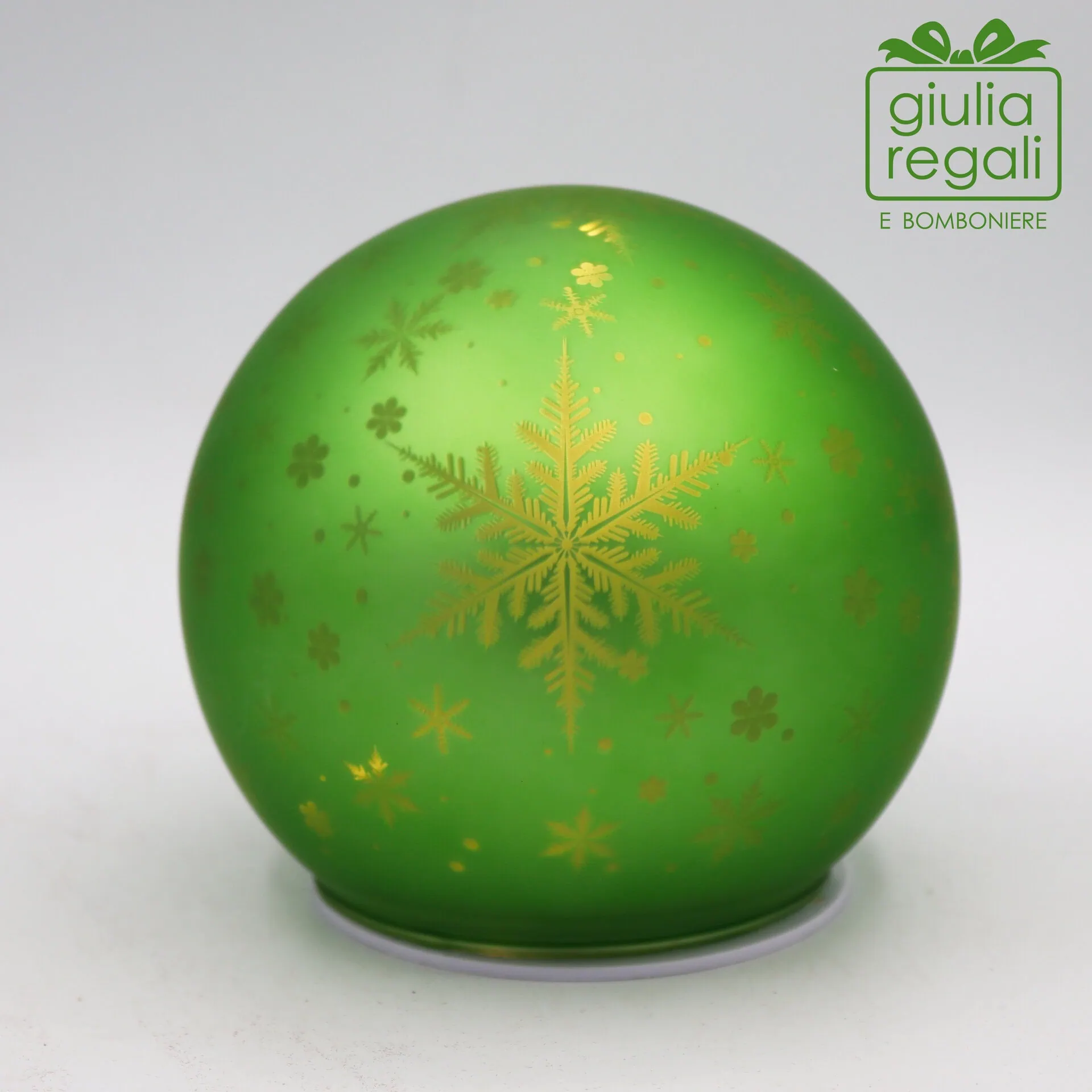 Sfera natalizia in vetro WALD con finitura verde e luce LED, confezionata in elegante scatola regalo illustrata.