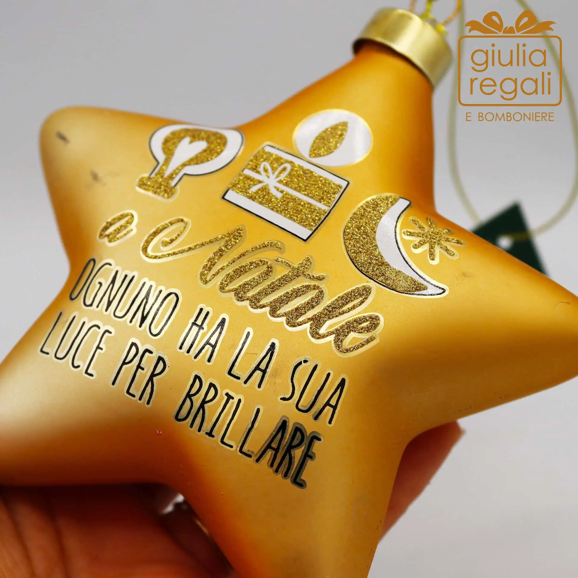Addobbo natalizio a forma di stella in vetro soffiato dorato, con la dolce frase “A Natale ognuno ha la sua luce per brillare”. Con elegante scatola regalo.