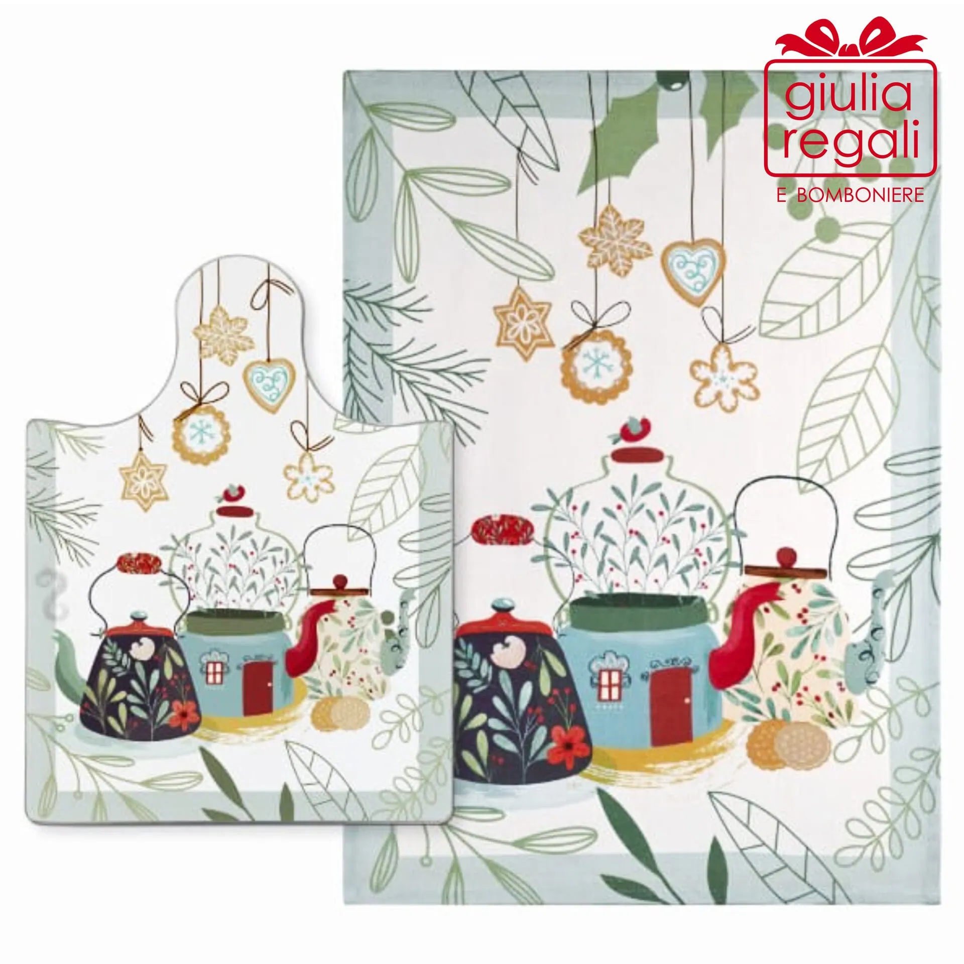 Set composto da tagliere in vetro temperato e strofinaccio in cotone decorato con graziose teiere, confezionato in un’elegante scatola regalo con bellissima illustrazione natalizia.